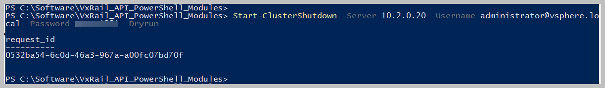 Start-ClusterShutdown -Server <VxM> -Username administrator@vsphere.local -Password pw -Dryrun