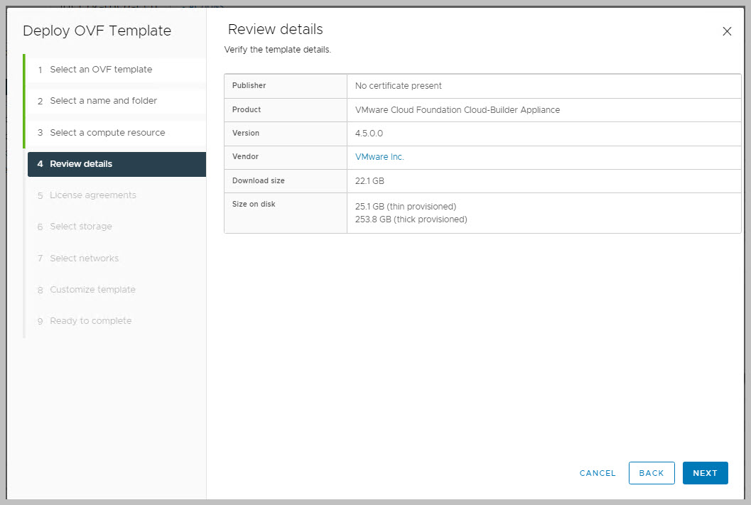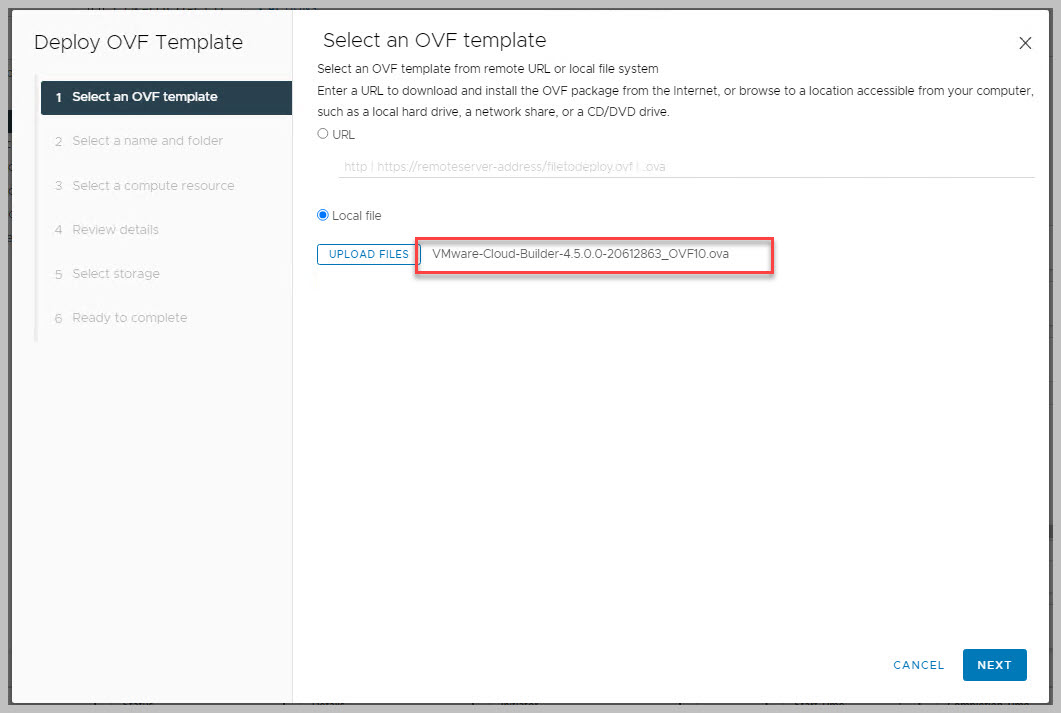 VCF On VxRail is deployed leveraging VMware Cloud Builder for which the OVA can be downloaded from VMware.com and deployed as follows: