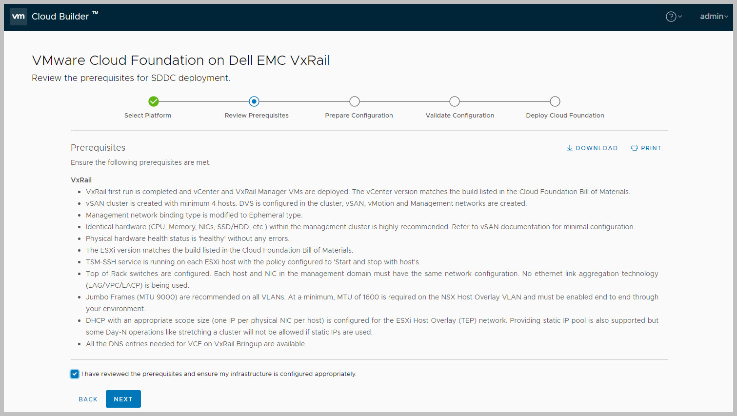 The following section details the VCF on VxRail Bring-Up. At this stage the Cloud Builder VM has been deployed, powered on and user logged into the Cloud Builder UI, from here you proceed as follow: