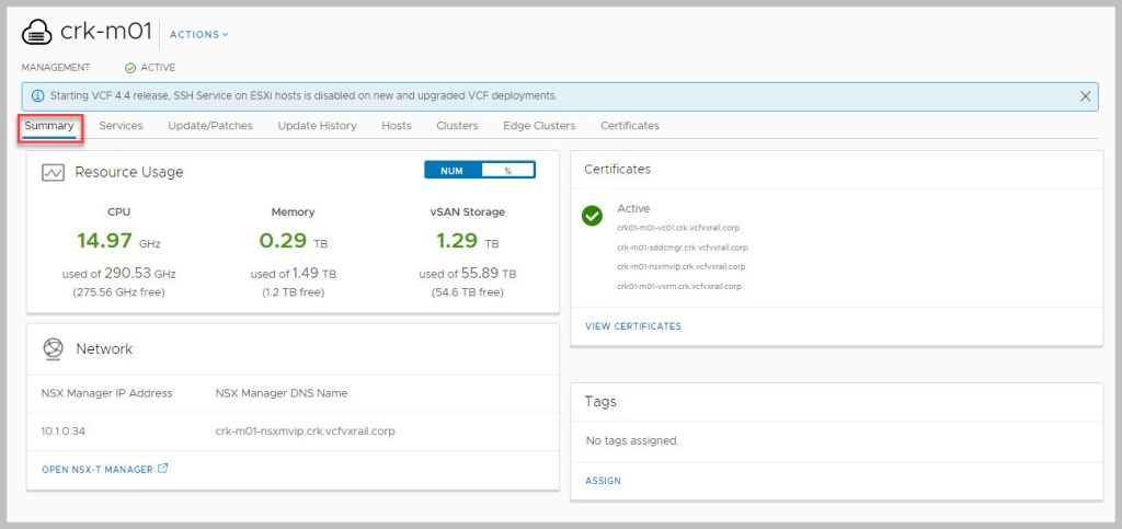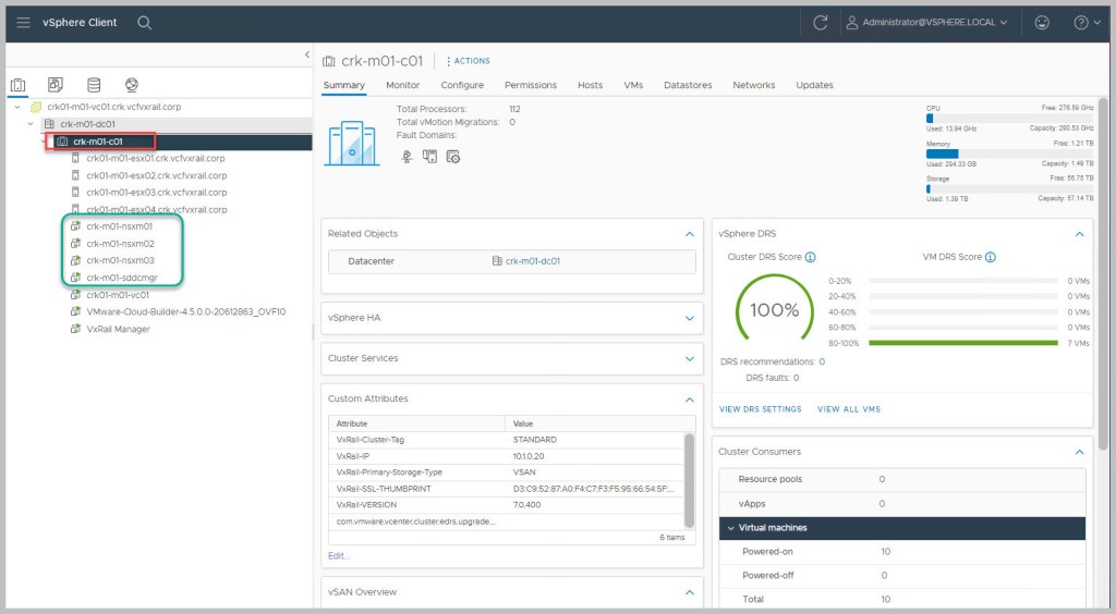 On completion of VCF Bring-up we review the Management Domain VMs created in vCenter by the VCF Bring-Up process and confirm automatic IP assignment from the DHCP IP pool for the NSX-T Virtual Tunnel Endpoints (VTEPs).