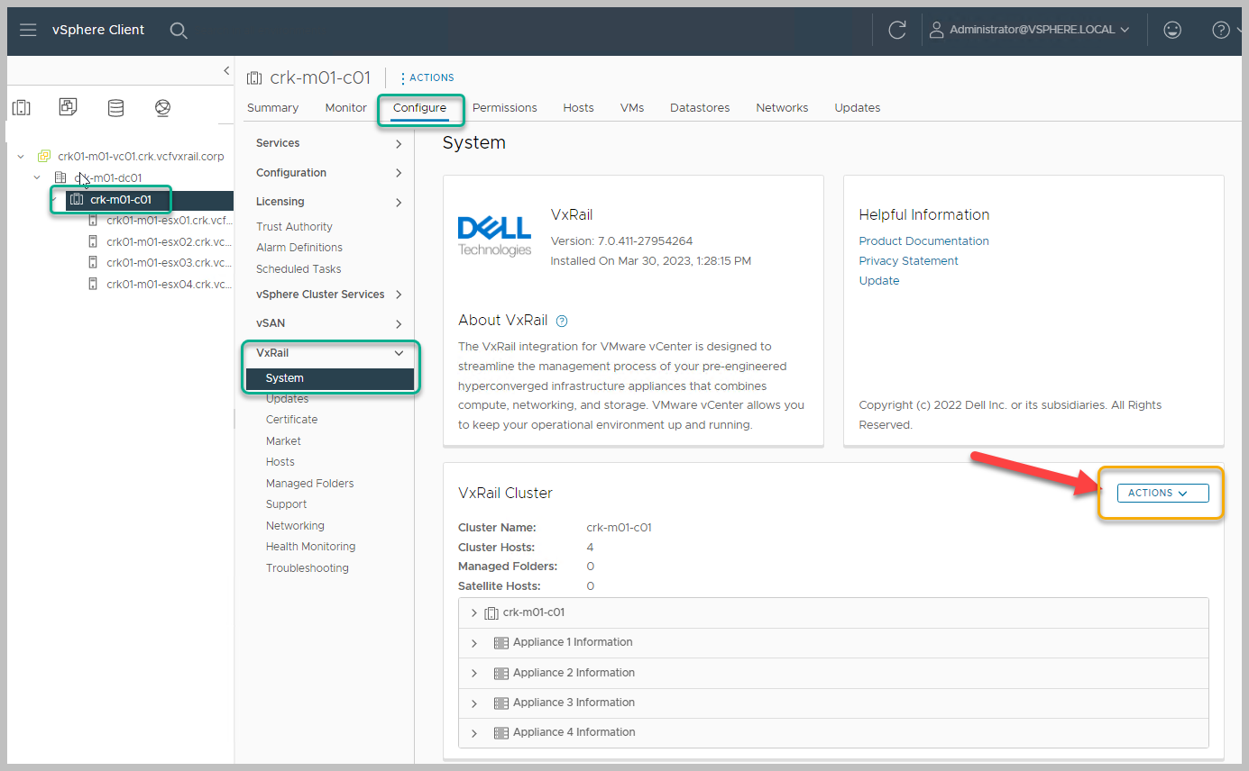 From the vSphere HTML UI navigate to cluster->Configure->VxRail->System:
