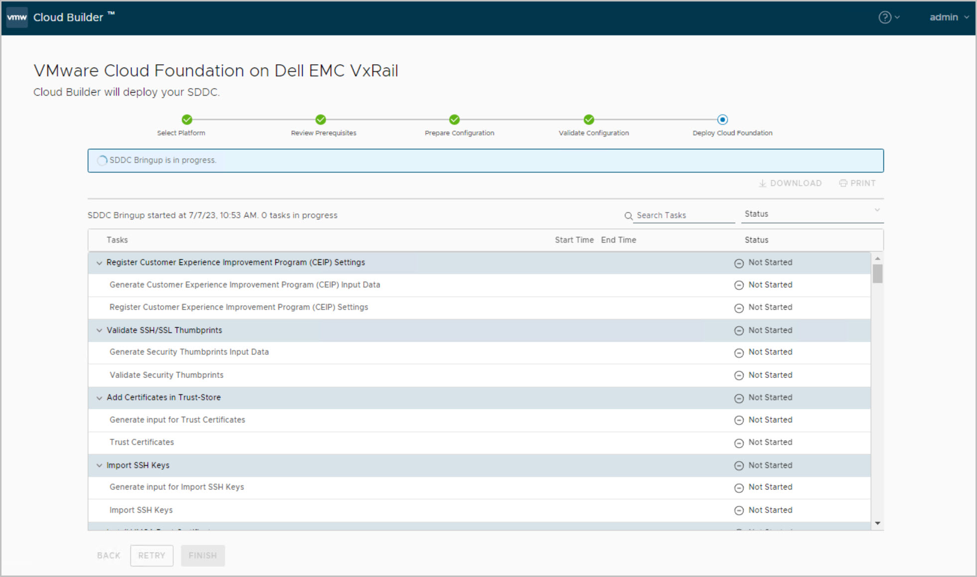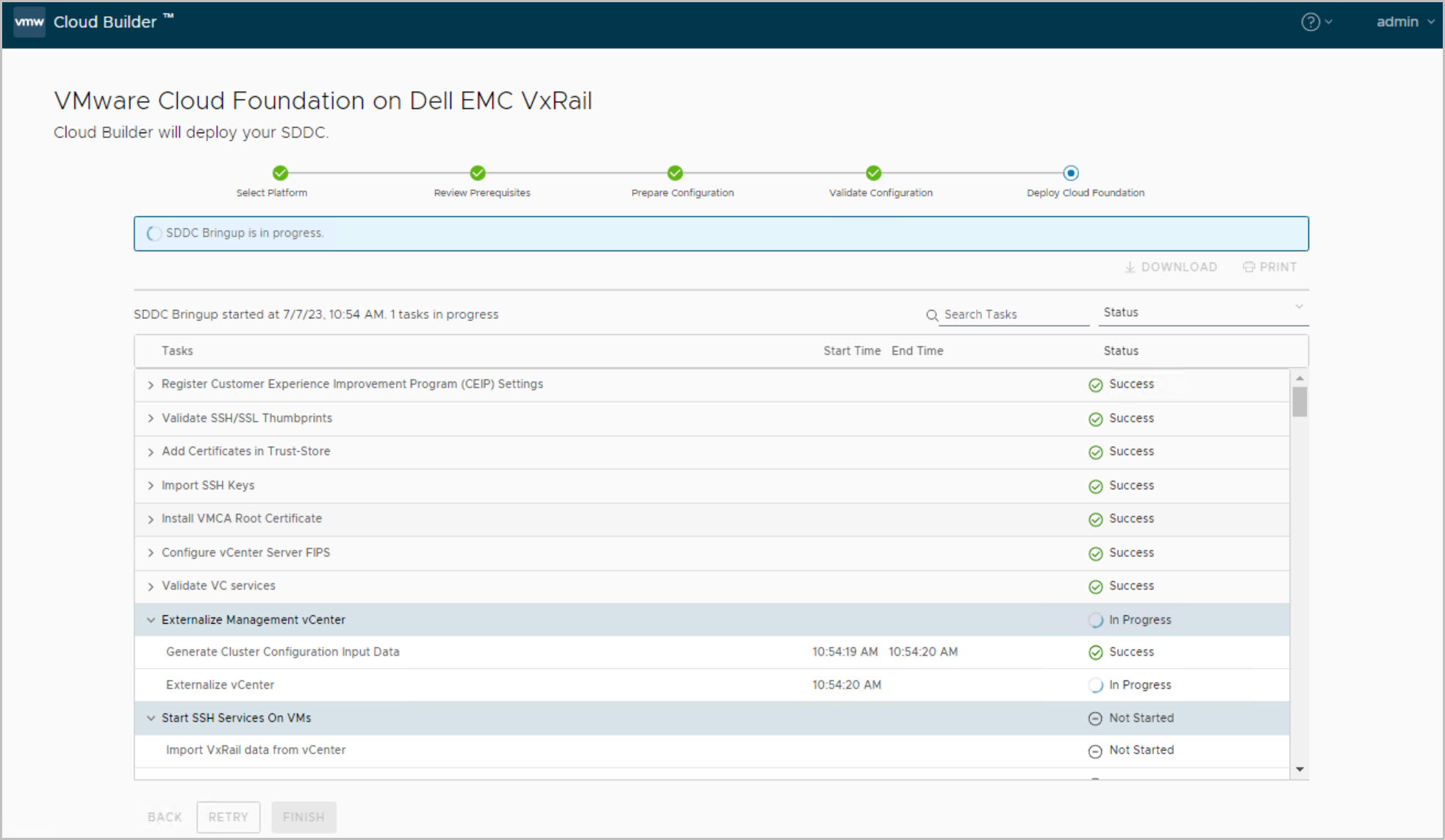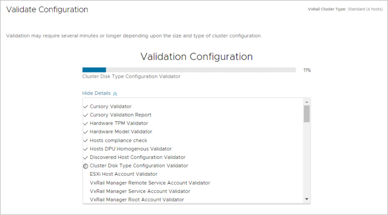 The VxRail bring-up of the Management Cluster is similar to a standard VxRail bring-up with embedded vCenter being deployed. Previously there was a requirement to externalize the vCenter using VxRail Manager plugin from the vCenter HTML client but this is now fully automated as part of the Cloud Builder Bring-Up process. Also changing the Management port group to Ephemeral port type post VxRail bring-up is also not required as it is now an option during the VxRail deployment as can be seen in the following walkthrough. SSH service on each ESXi host is disabled by default as part of the bring-up. Tasks include: