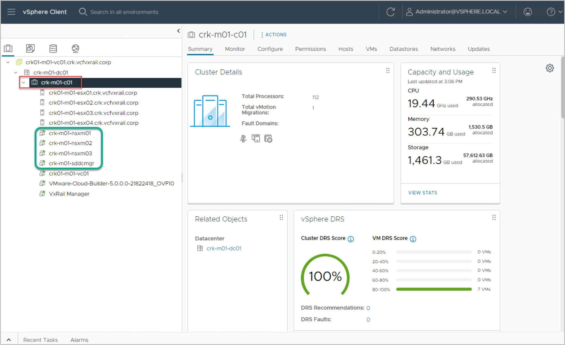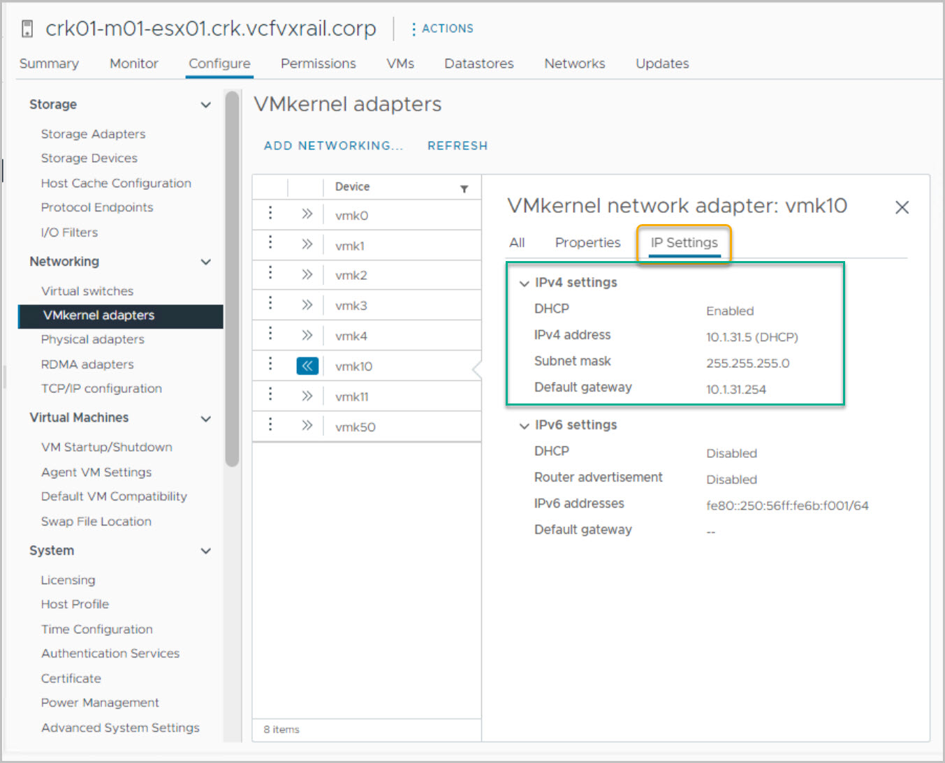 On completion of VCF Bring-up we review the Management Domain VMs created in vCenter by the VCF Bring-Up process and confirm automatic IP assignment from the DHCP IP pool for the NSX-T Virtual Tunnel Endpoints (VTEPs).
