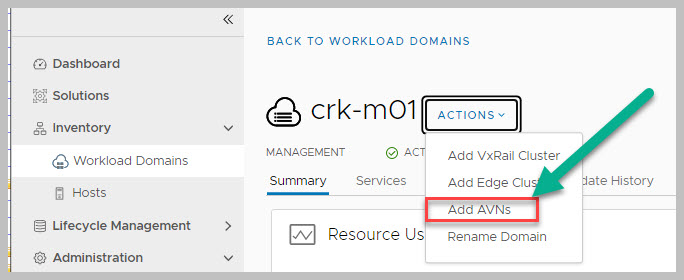 Go to SDDC Manager UI Select Inventory > Workload Domains. Click on the name of the Management domain Select Actions > Add AVNs: