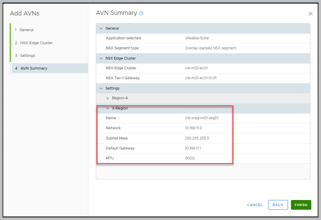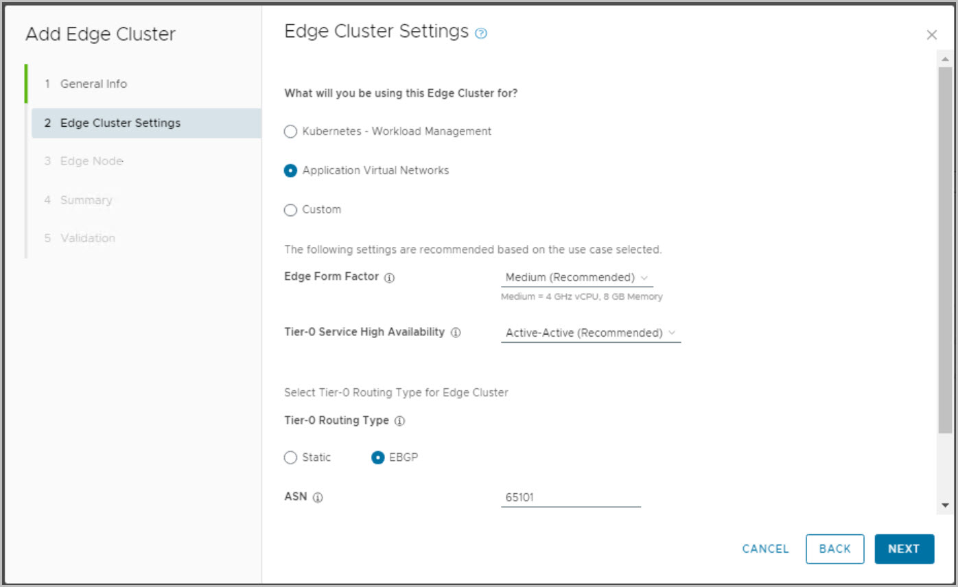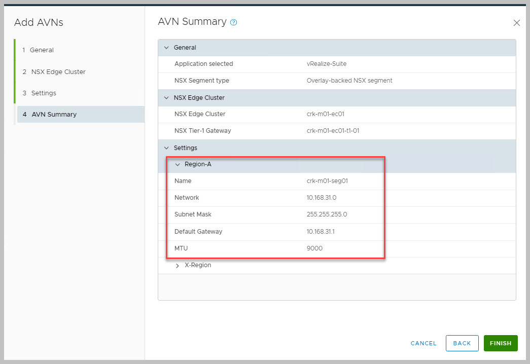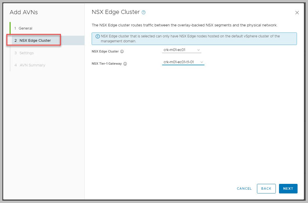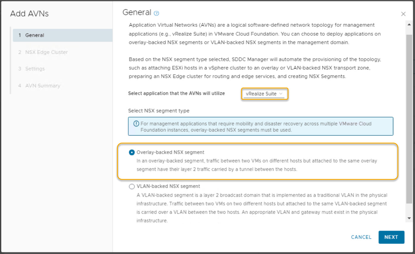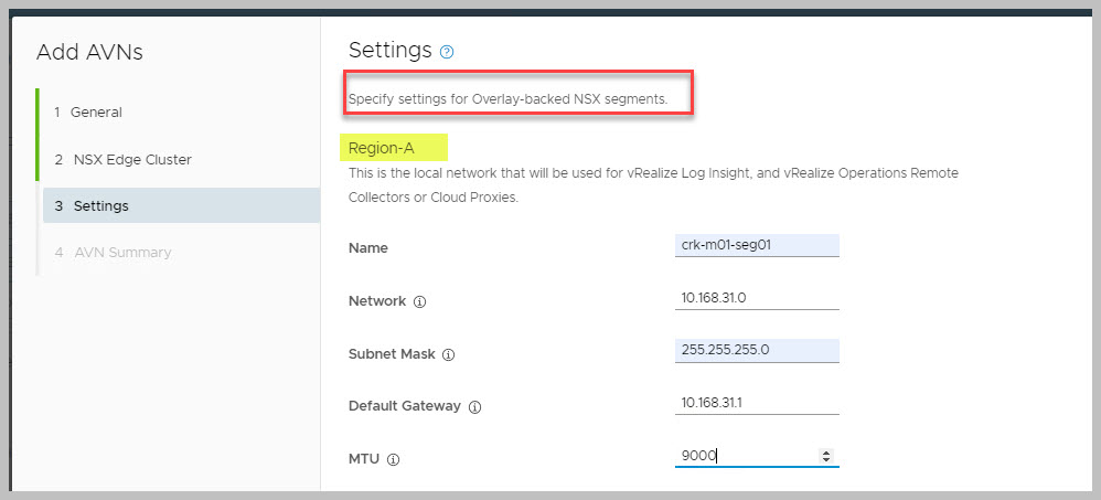 Application Virtual Networks (AVNs) are a requirement in order to support the deployment of the vRealize Suite set of products. AVNs are dependent on NSX edge gateways having being deployed in the management WLD as a pre-requisite. The following steps detail how to deploy an NSX Edge cluster followed by deploying AVNs leveraging SDDC Manager automation. Required details for the deployment include the usual: