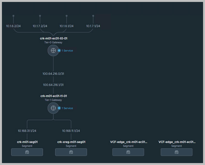 The following depicts the architectural view from within NSX Manager for the Edge solution. The Tier-0 gateway provides routing to the external network while the Tier-1 connected to Tier-0 provides the N/S comms for the internal network: