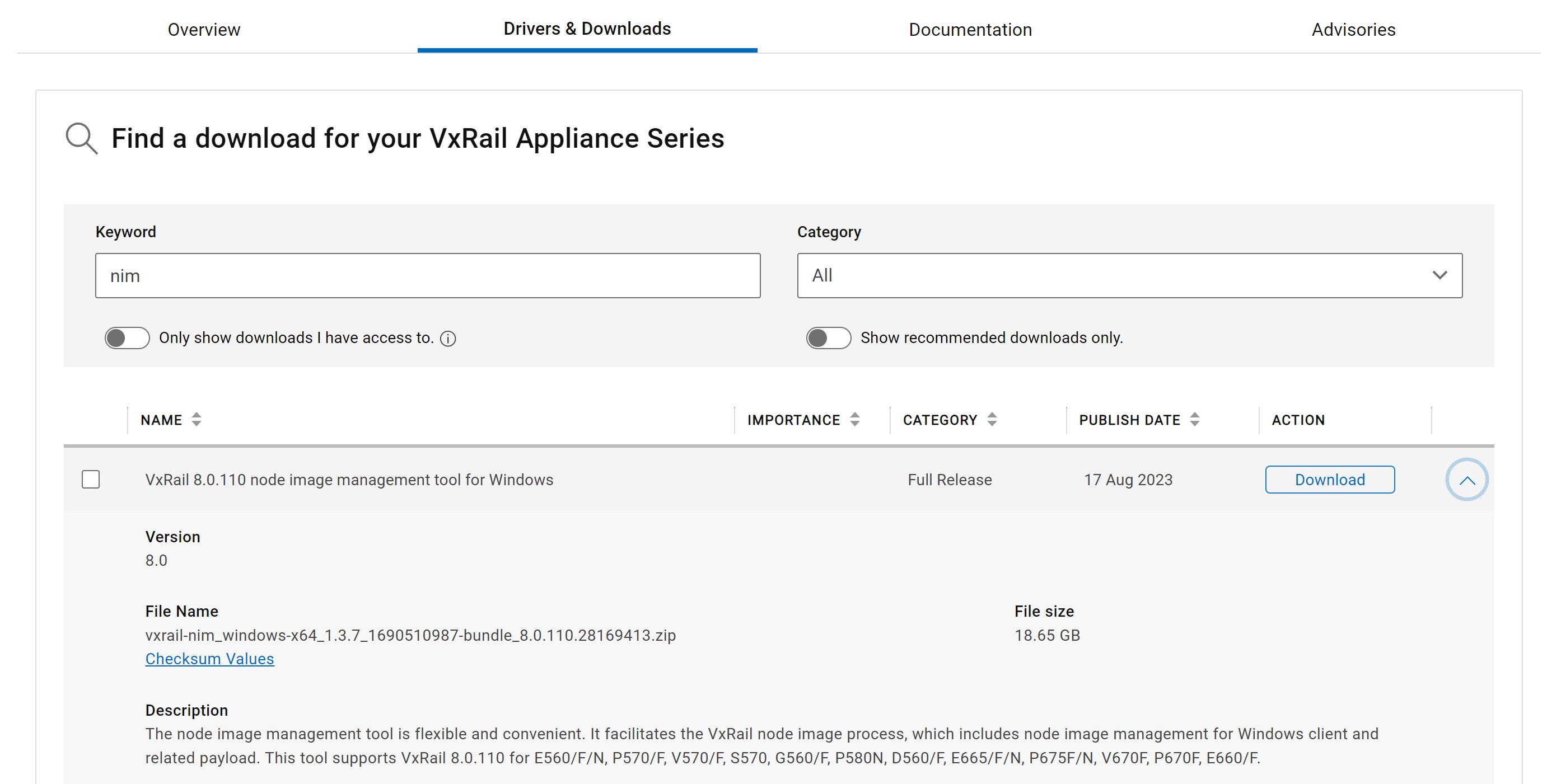 Begin by downloading the NIM Tool from the VxRail support site. This example showcases re-imaging four VxRail E560F nodes to code version 8.0.110: