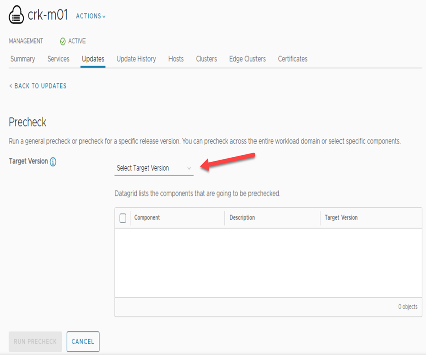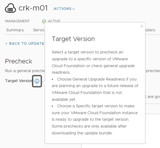 The Target Version dropdown selection will only show target versions from VCF 5.x once SDDC Manager has been updated to 5.0. Prechecks are specific to the VCF target release.
