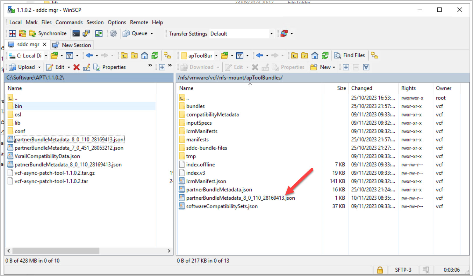 cd /home/vcf/asyncPatchToolls -alhtar -xvf vcf-async-patch-tool-1.1.0.2.tar.gzchmod -R 755 /home/vcf/asyncPatchToolchown -R vcf:vcf /home/vcf/asyncPatchToolls -laNext navigate to the /bin directory where the APT is located and list the available patches to gather the required details for enabling the vCenter patch: