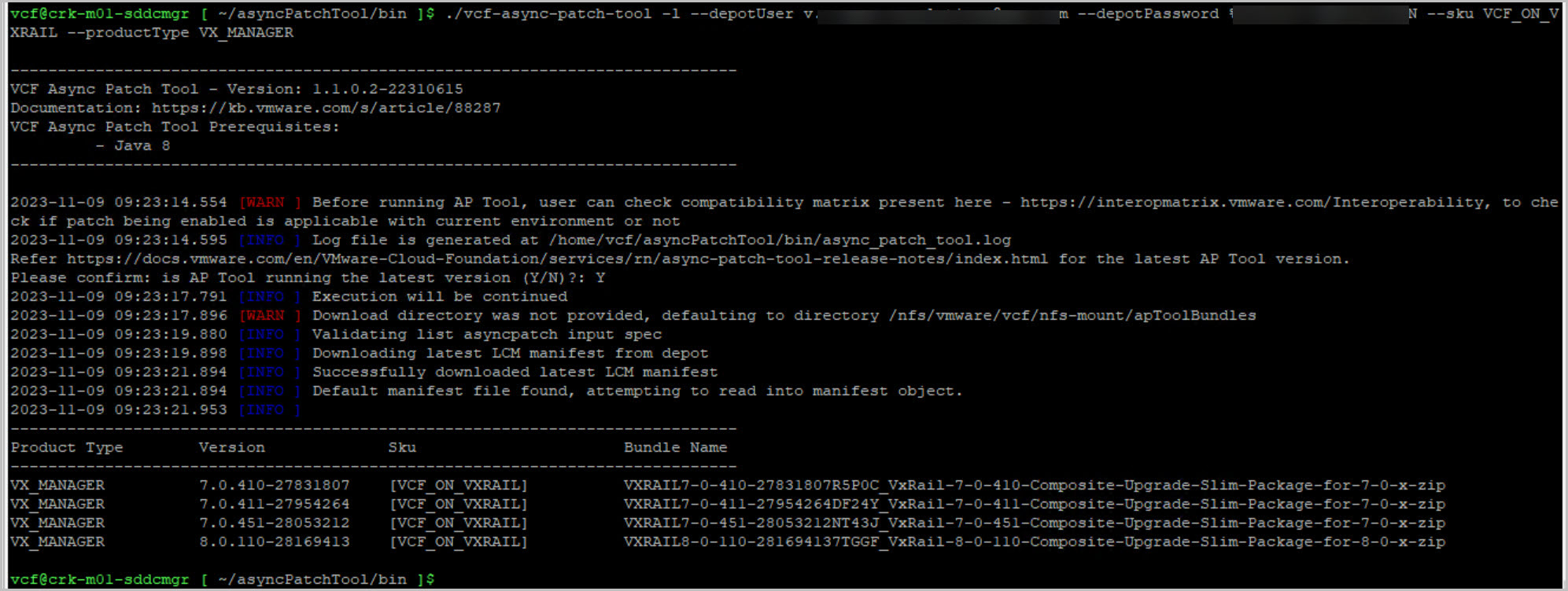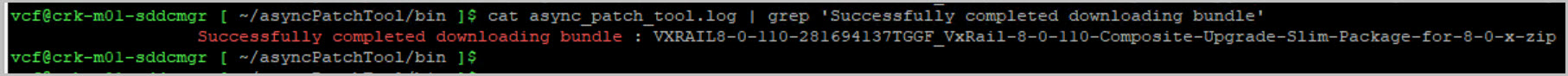 cd /home/vcf/asyncPatchTool/bin/./vcf-async-patch-tool -l --depotUser depotusername --depotPassword password --sku VCF_ON_VXRAIL –productType VX_MANAGERCopy the VxRail async patch-specific partner bundle metadata file using KB 91830.