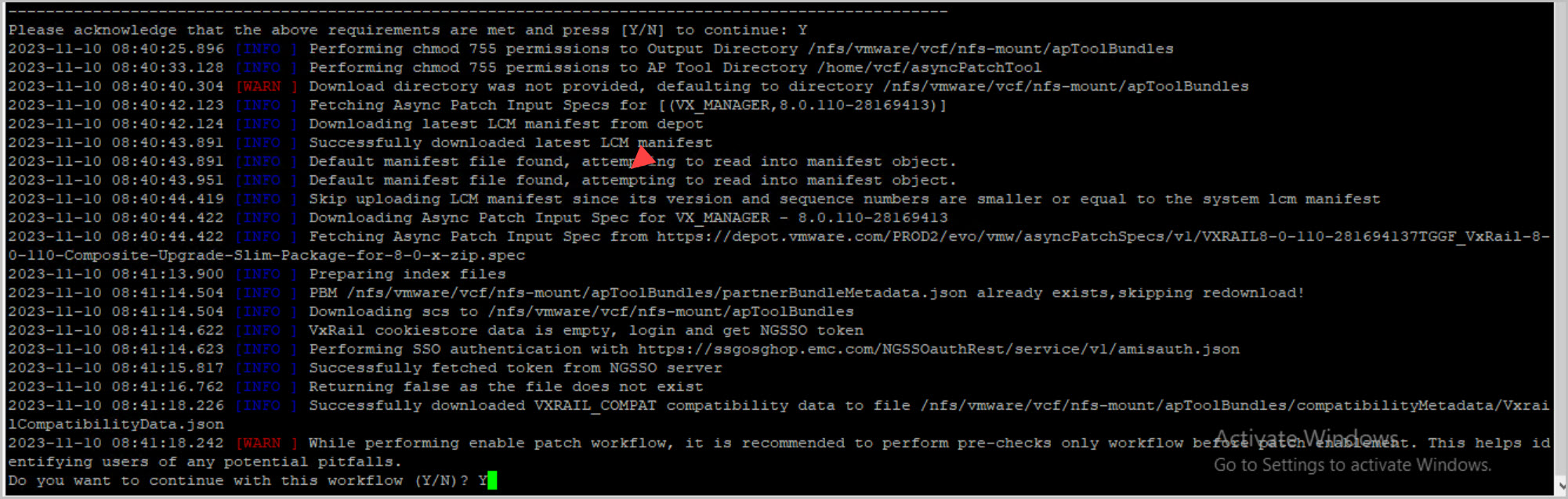 Then run the commands to precheck & enable the patch and follow the prompts to enter credentials including the DELL Depot u/n & p/w: