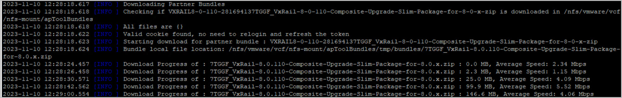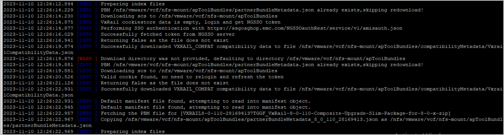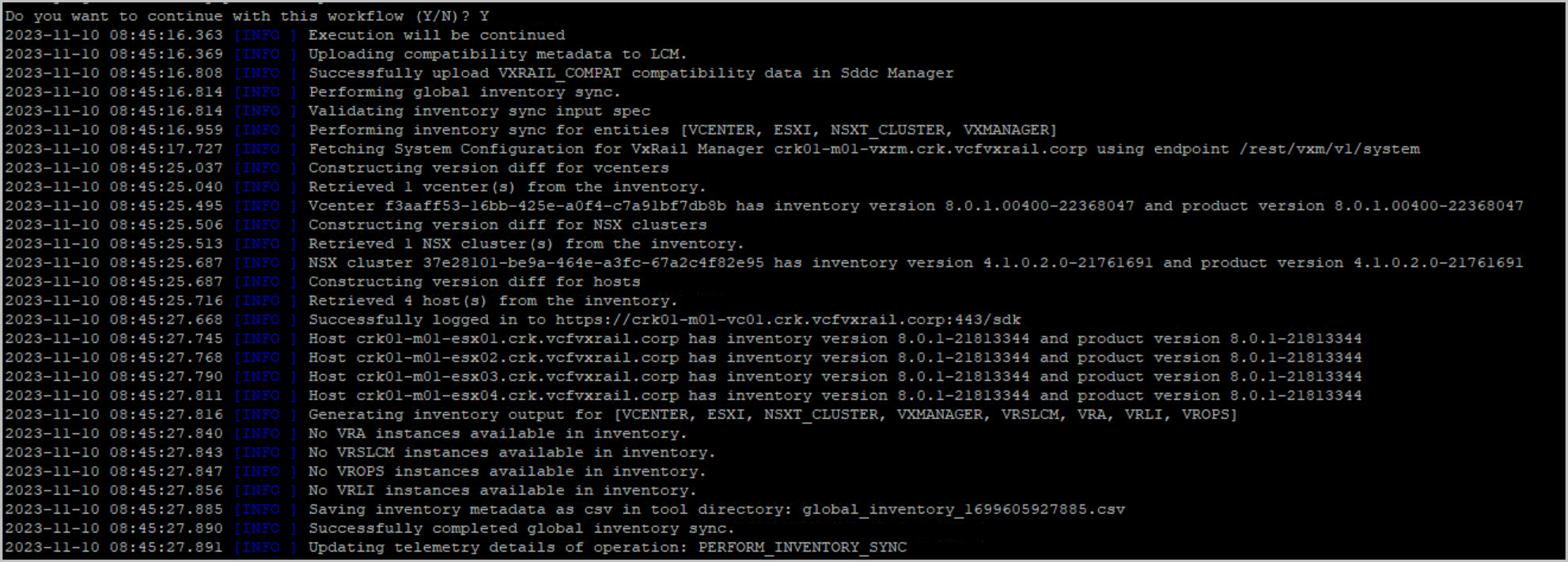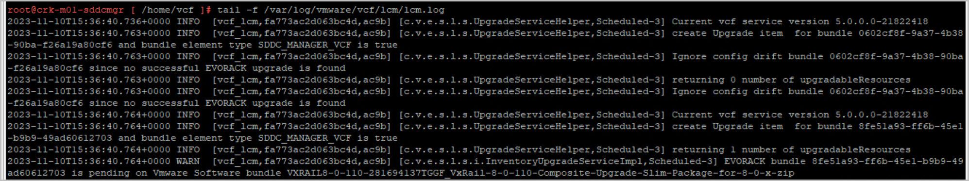 tail -f /var/log/vmware/vcf/lcm/lcm.logcat /var/log/vmware/vcf/lcm/lcm.log | grep "reached final state COMPLETED_WITH_SUCCESS"Upgrade of VxRAIL COMPLETED SUCCESSFULLY!