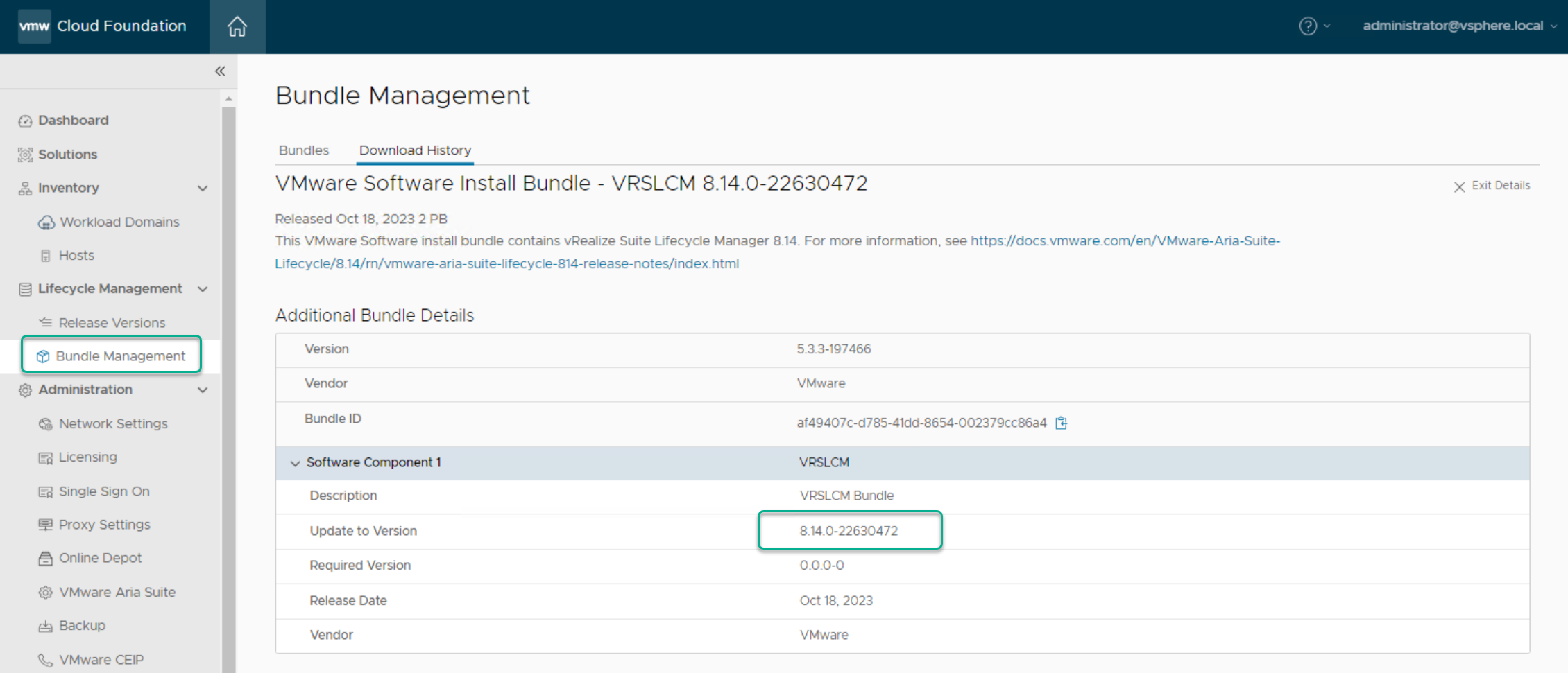 Before we can deploy Aria Suite Lifecycle we first need to download the the Aria Suite Lifecycle product Binary. From within the SDDC Manager console click Bundle Management and download the VMware Software Install Bundle –Aria Suite Lifecycle 8.14: