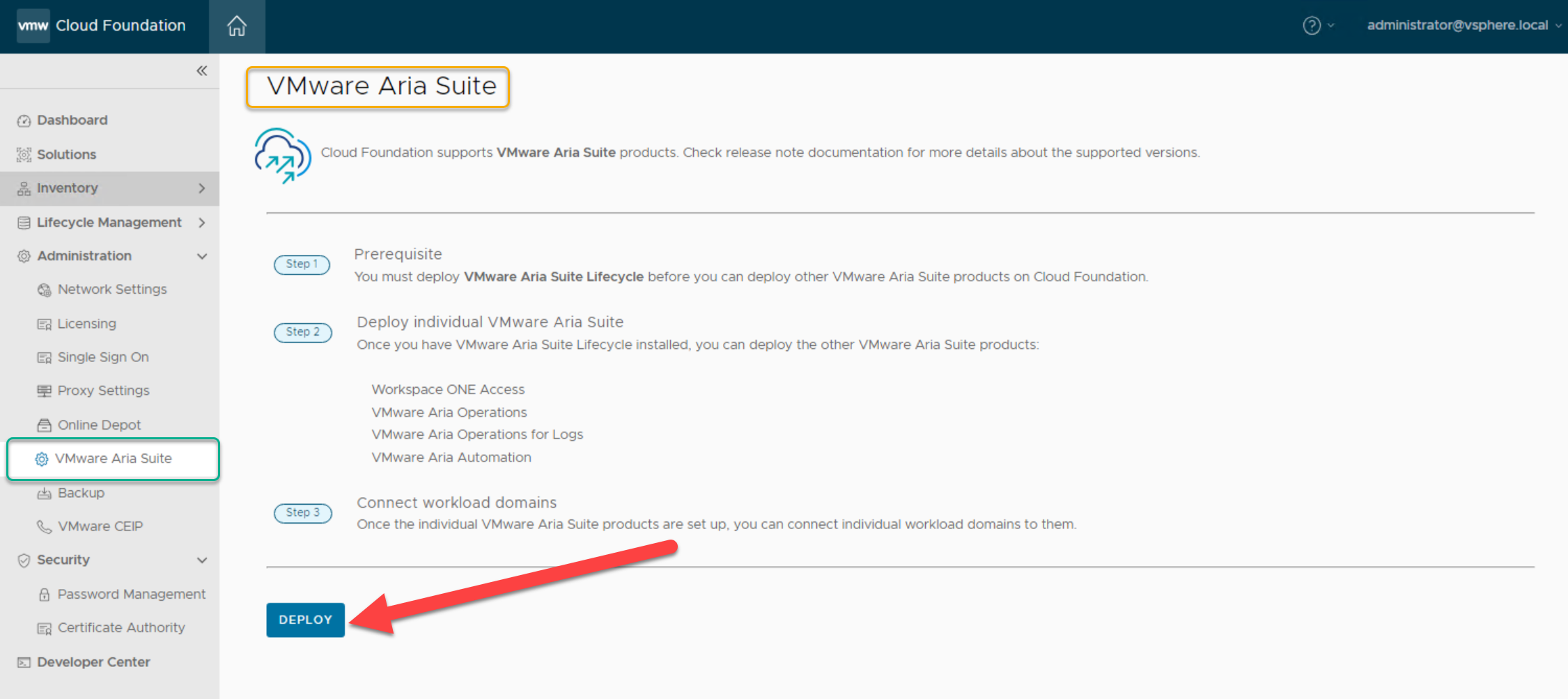 To begin the deployment of Aria Suite Lifecycle navigate to Administration->Aria Suite and click DEPLOY:
