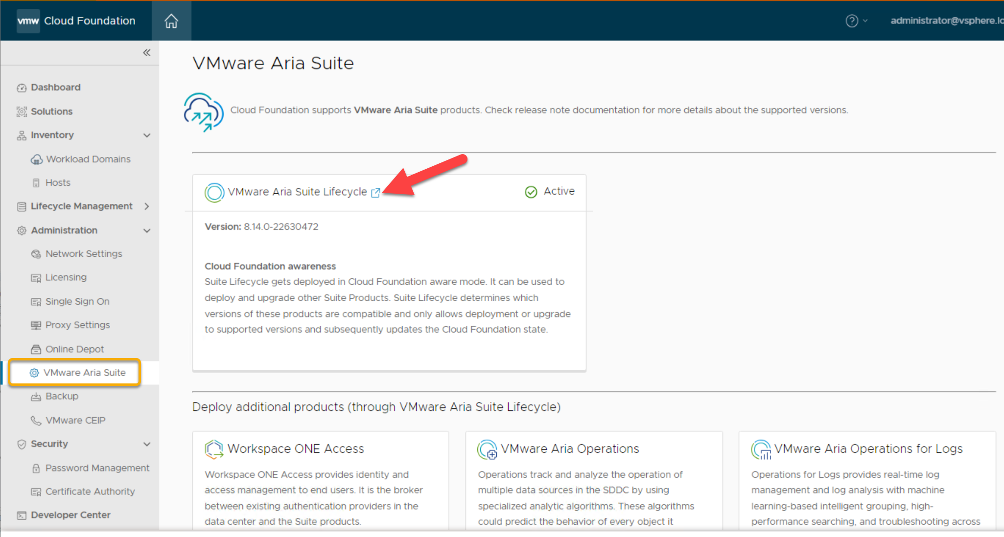 On successful completion of the Aria Suite Lifecycle deployment task it is now possible to log into Aria Suite Lifecycle console via SDDC Manager, navigate to Administration->Aria Suite->Aria Suite Lifecycle and click the lick Aria Suite Lifecycle link to launch:
