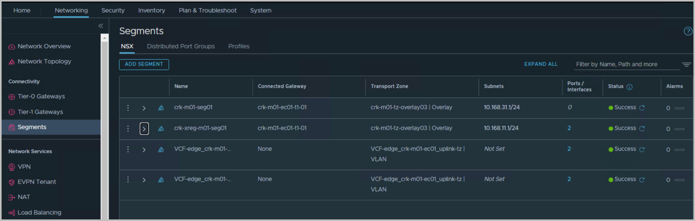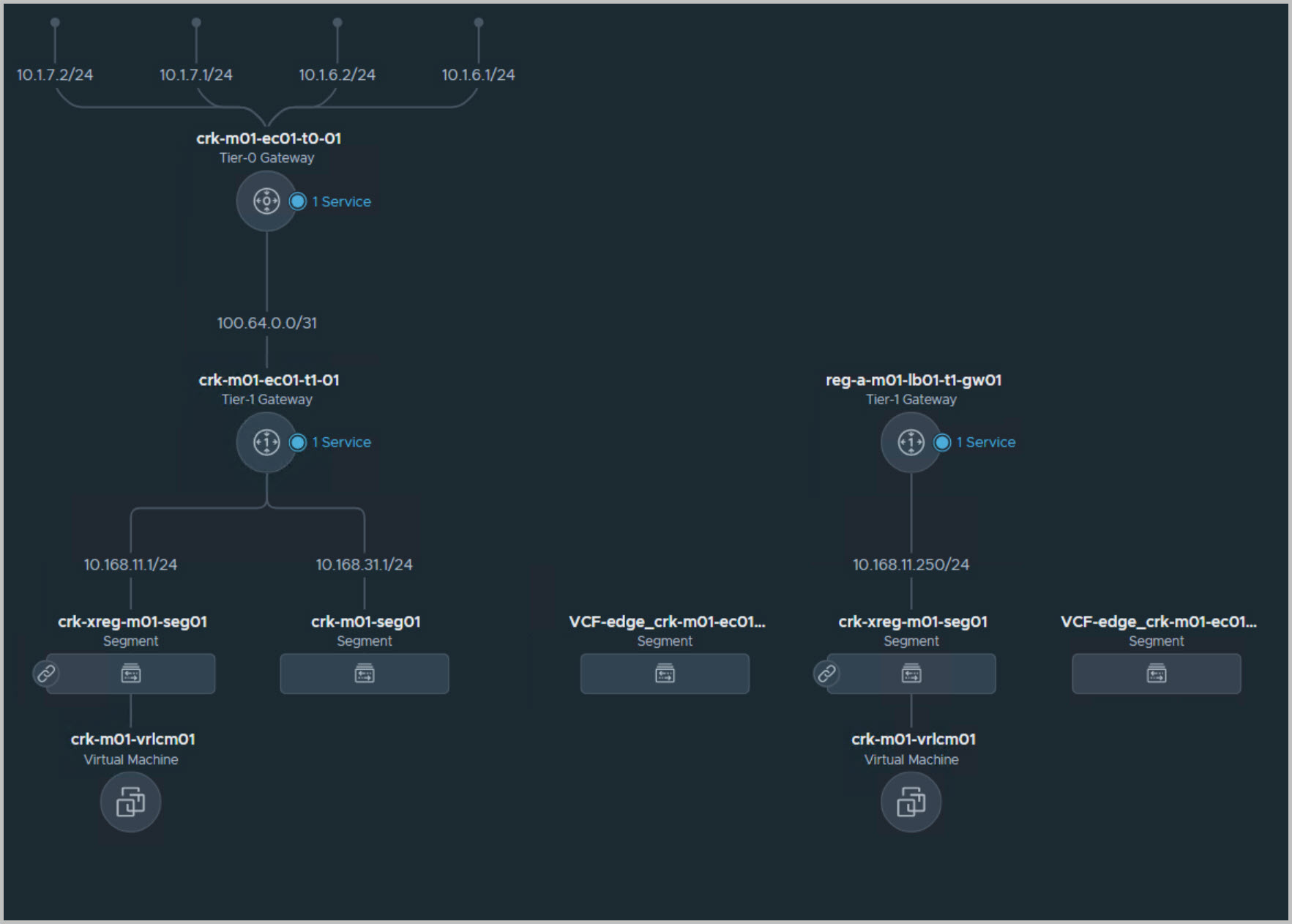 Network topology view from NSX-T manager UI details the Application Virtual Network including the two NSX-T Edge virtual appliances in the management workload domain to support upstream connectivity for the AVN (the 2 edges are hosting the T0&1 G/W’s):