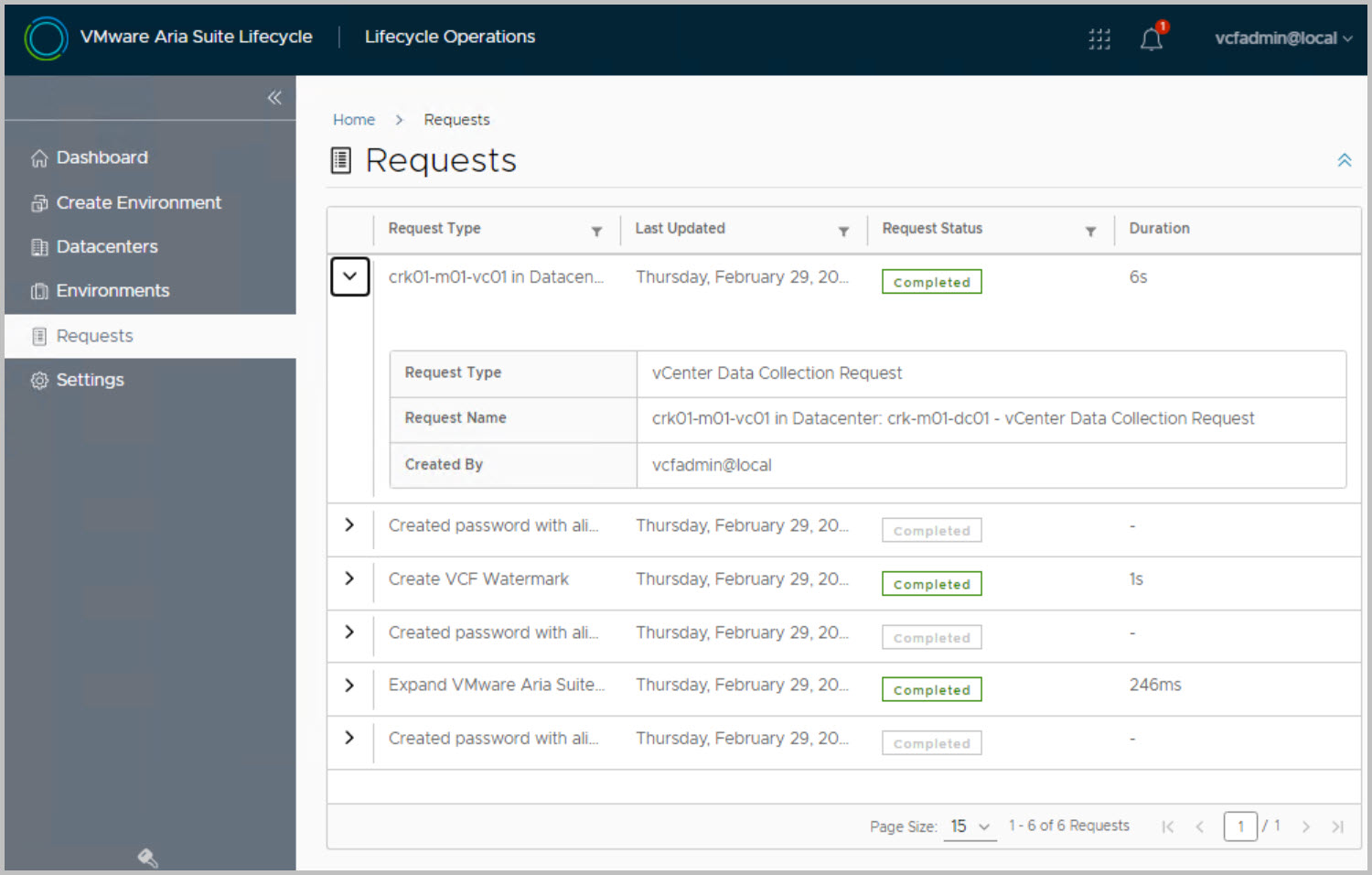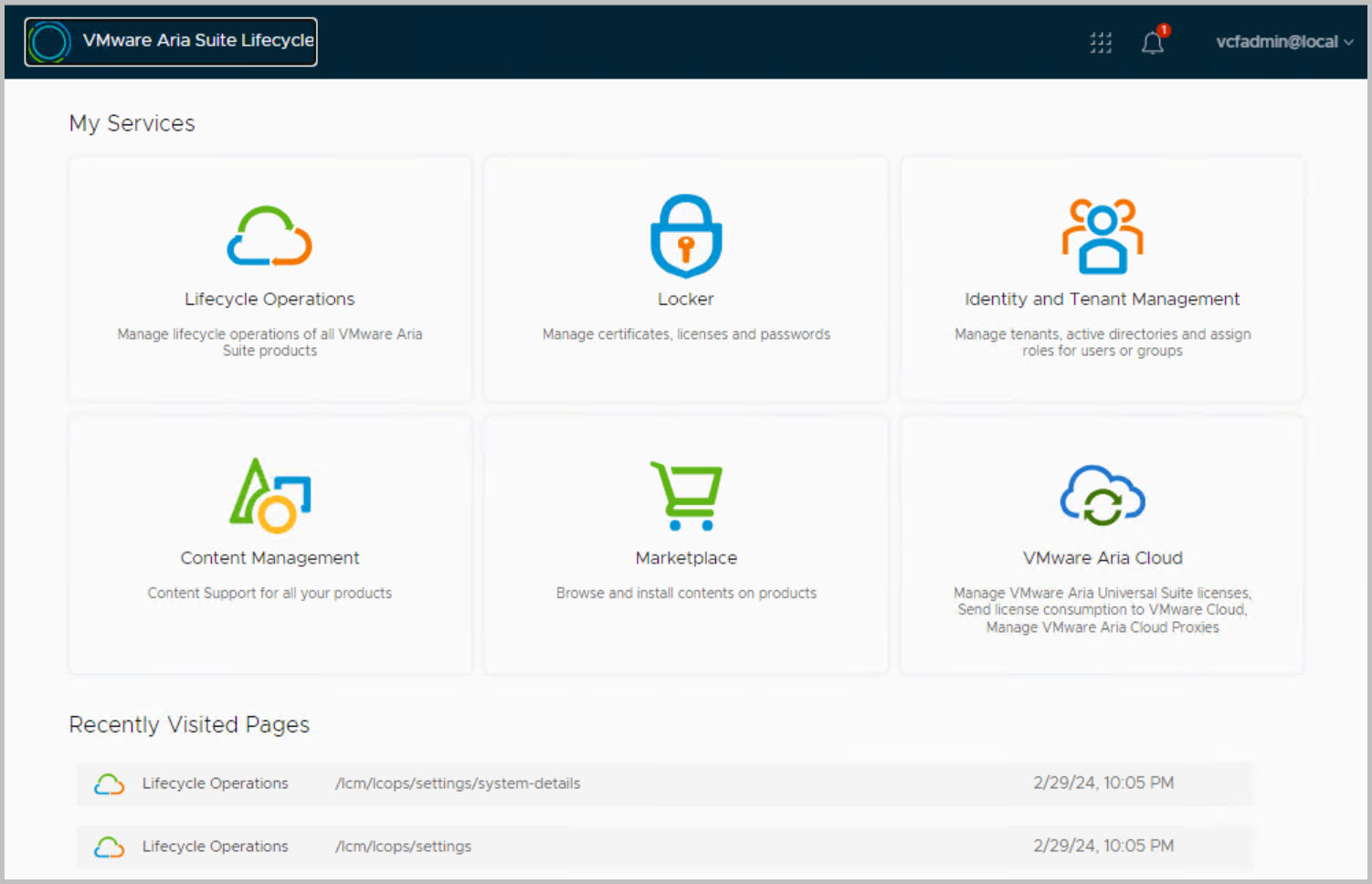 The Aria Suite Lifecycle console opens and from here we can see the config and imports applied as part of the SDDC Mgr deployed Aria Suite Lifecycle: