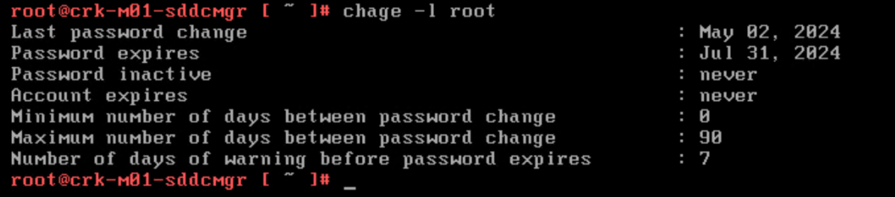 Root user password expired or is near expiration. This is a critical error if the password expired, and a warning if there are 30.0 or fewer days before it expires.