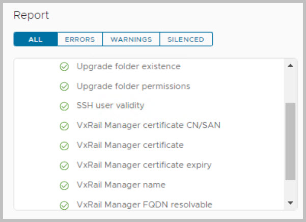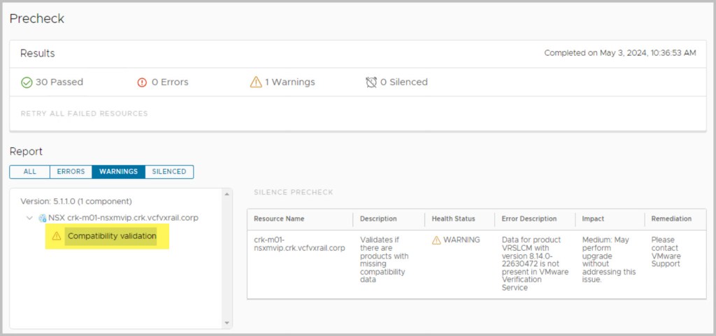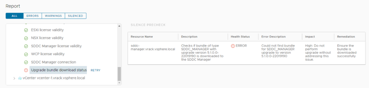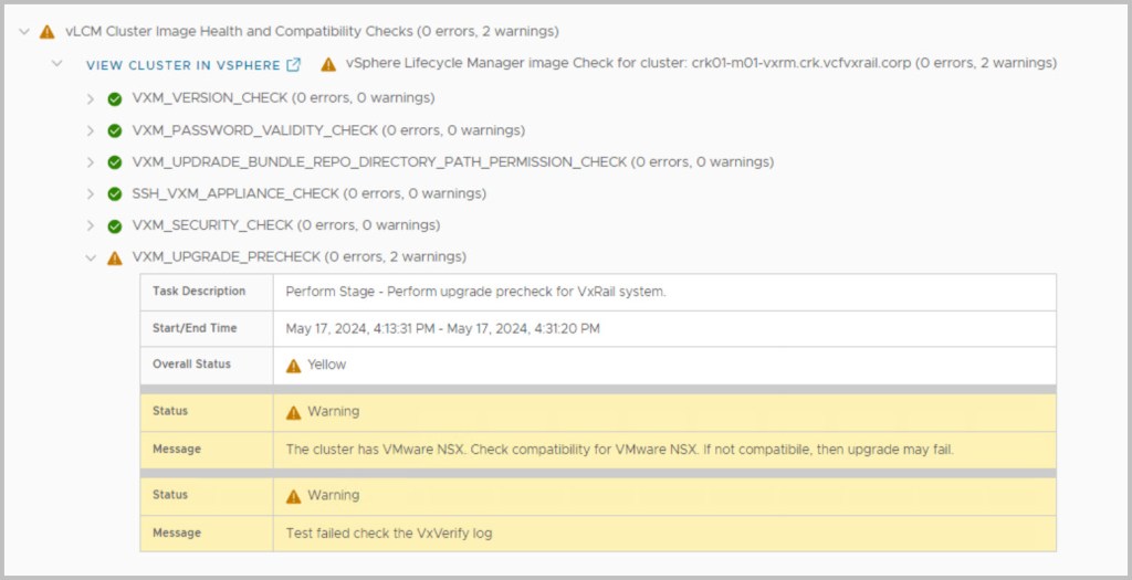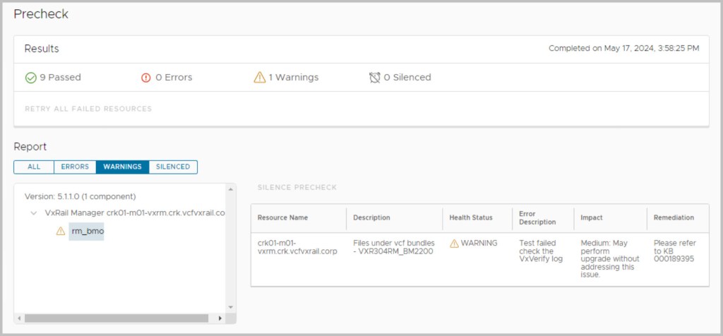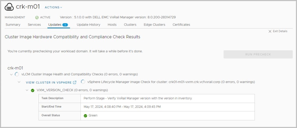Ensure to run the upgrade Precheck tasks from within SDDC Manager in order to validate VCF is in a healthy state before proceeding with each of the upgrades and view the health status of each component by expanding their respective results. If the precheck has failed, fix the issue and then retry the precheck task to repeat the validation process. (More details on context level prechecks here). It is also advisable to run VxVerify – Pre-upgrade Health Check Tool.