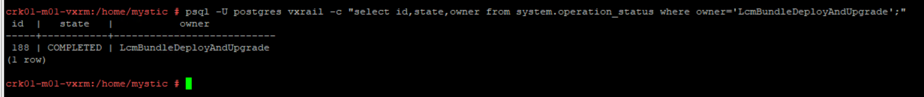 psql -U postgres vxrail -c "select id,state,owner from system.operation_status where owner='LcmBundleDeployAndUpgrade';"