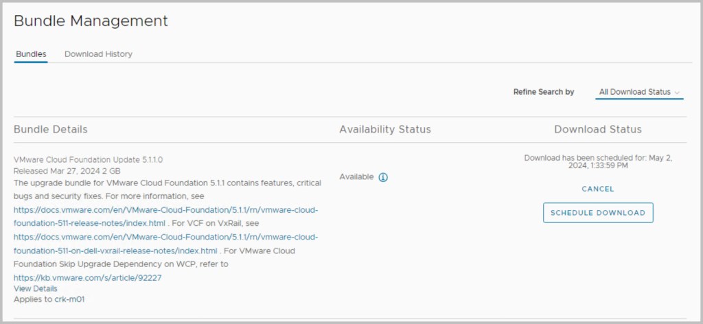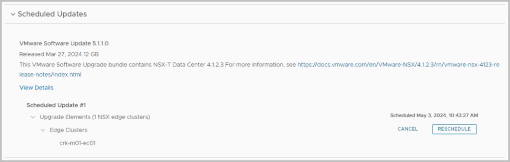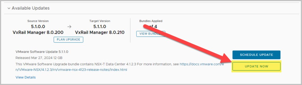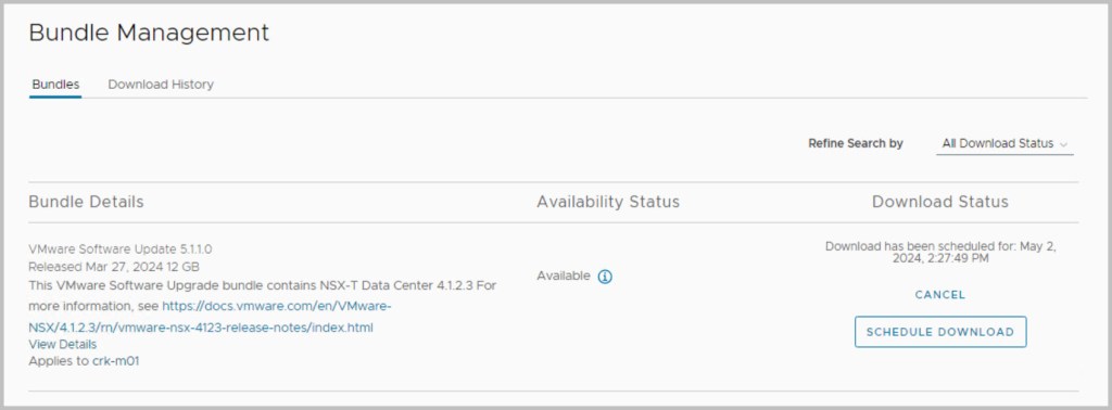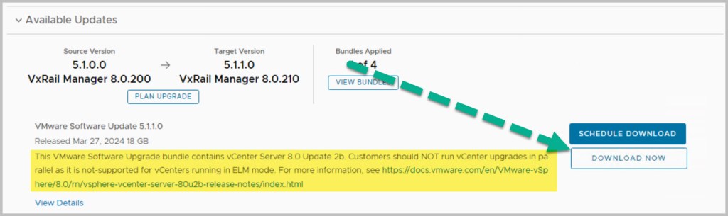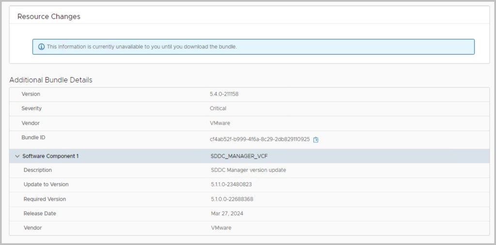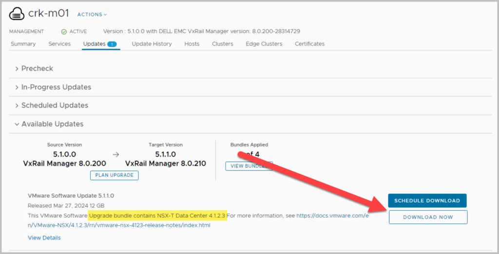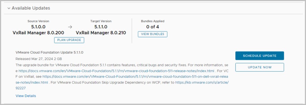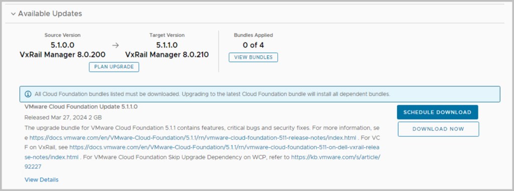 The sequence of the upgrade is defined within SDDC Manager itself. SDDC Manager presents the next available upgrade bundle throughout the procedure which makes the overall procedure quite easy and seamless to the end user performing the upgrade. In an effort to incrementally speed up the process of upgrading it is advisable to download all the required bundles in advance (bundles marked as available/future apply), as some of the bundles can be quite large in size for example the NSX bundle is 12GB. After each of the bundles have been downloaded click View Details, which details the version changes that will be applied as part of the bundle upgrade. The update bundles can be applied manually or scheduled for a preferred time window.