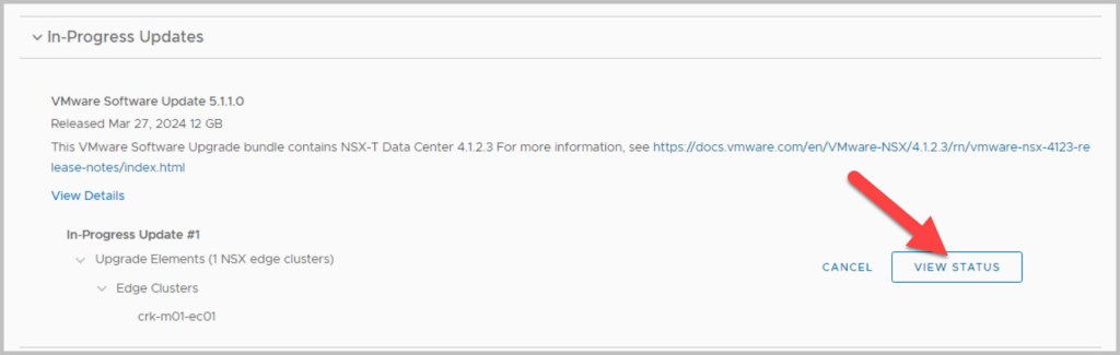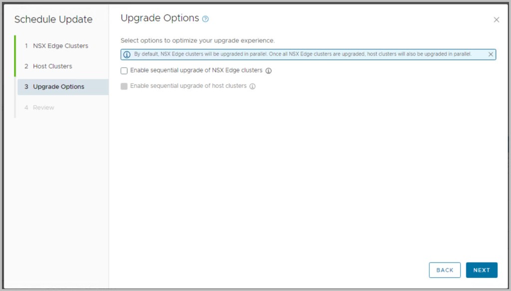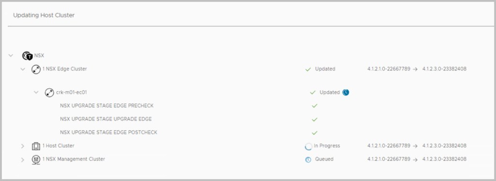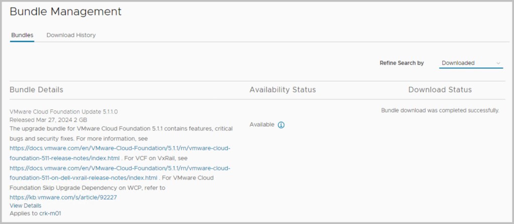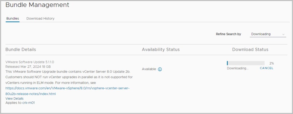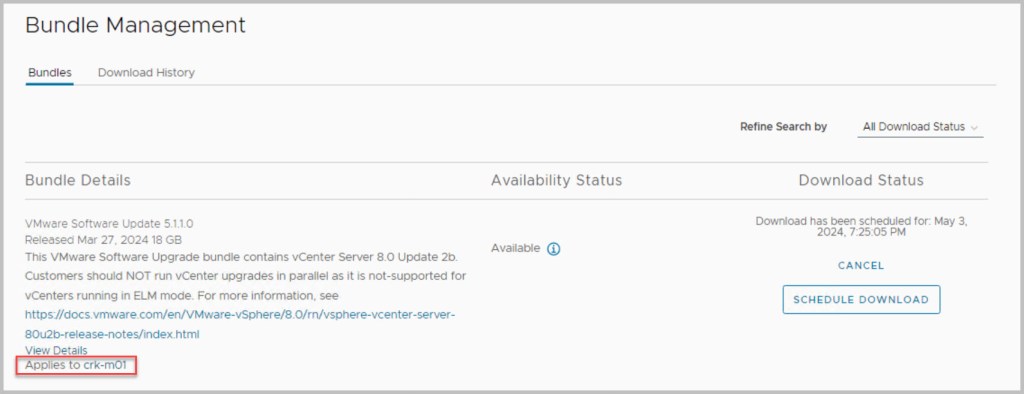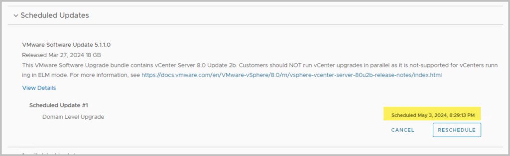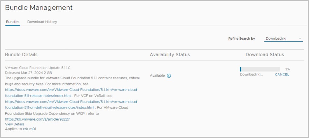 The sequence of the upgrade is defined within SDDC Manager itself. SDDC Manager presents the next available upgrade bundle throughout the procedure which makes the overall procedure quite easy and seamless to the end user performing the upgrade. In an effort to incrementally speed up the process of upgrading it is advisable to download all the required bundles in advance (bundles marked as available/future apply), as some of the bundles can be quite large in size for example the NSX bundle is 12GB. After each of the bundles have been downloaded click View Details, which details the version changes that will be applied as part of the bundle upgrade. The update bundles can be applied manually or scheduled for a preferred time window.