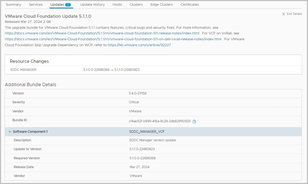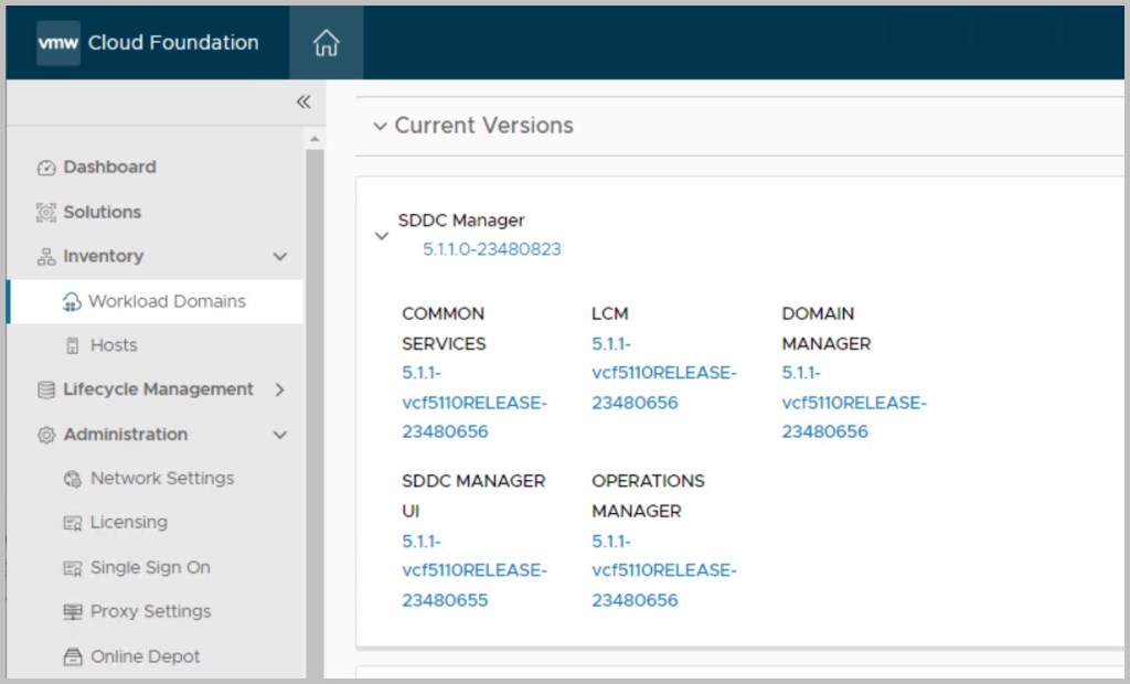 In relation to this particular example upgrade of VCF 5.1 -> 5.1.1 we can again view from the ‘Release Versions’ in SDDC Manager the components being upgraded and their code versions & build numbers.