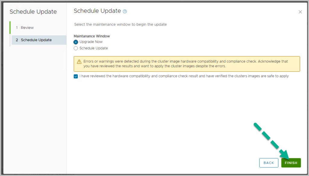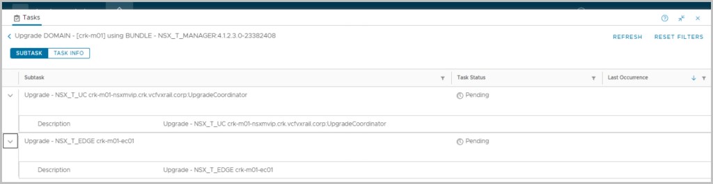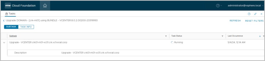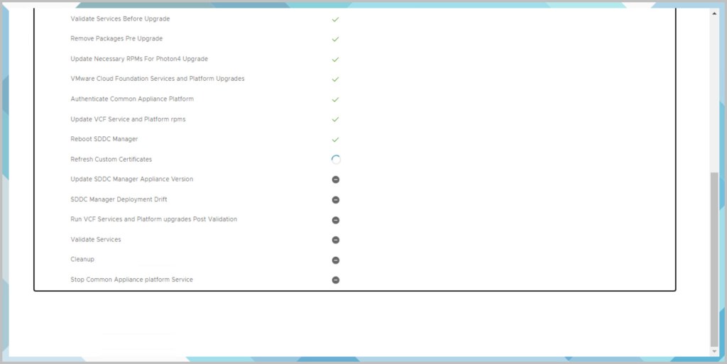 Important: Before proceeding with the upgrade ensure to take snapshots of your management virtual machines. Do not perform any SDDC workflows such as VI WLD creation or WLD expansions during the upgrade and confirm no failed workflows or errors are displayed in SDDC manager.