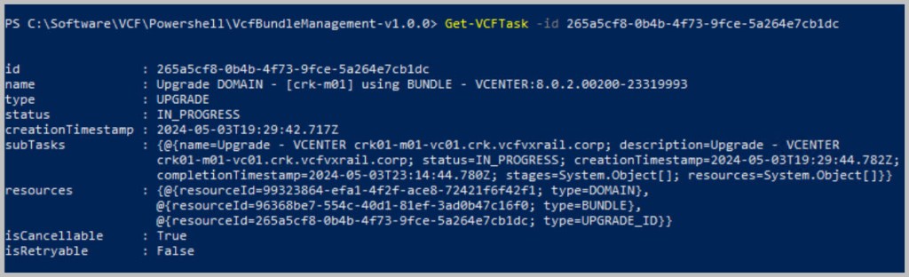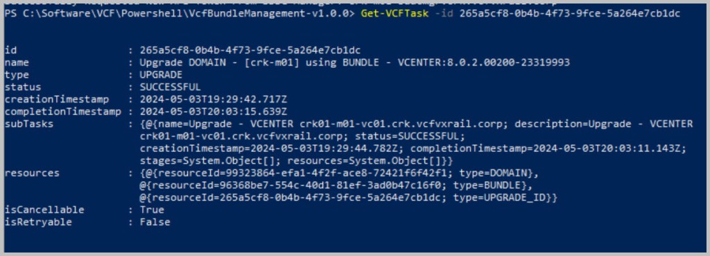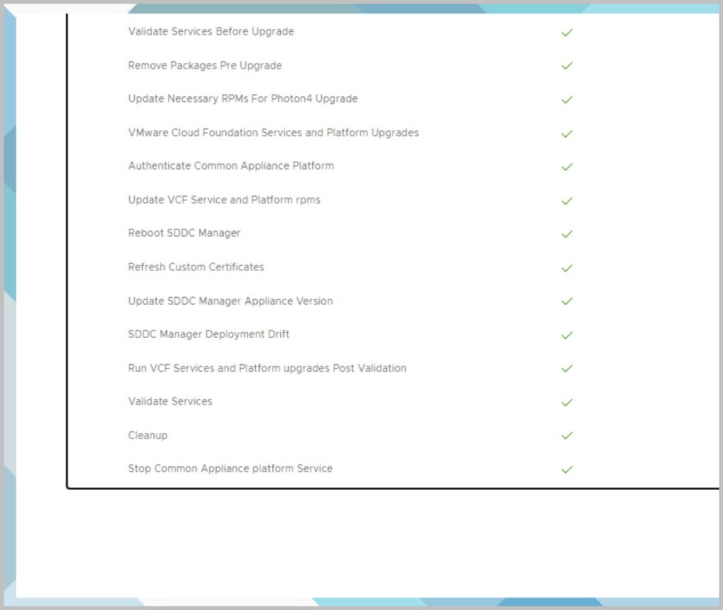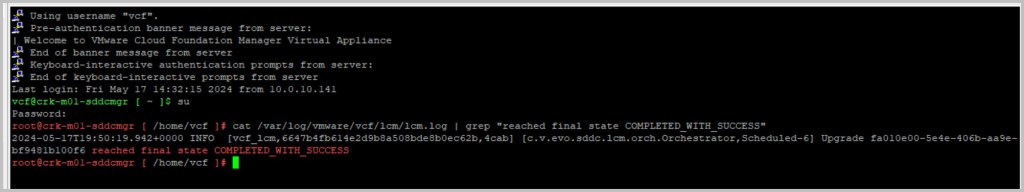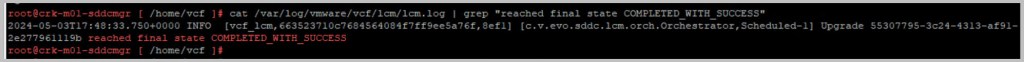 cat /var/log/vmware/vcf/lcm/lcm.log | grep “reached final state COMPLETED_WITH_SUCCESS”
