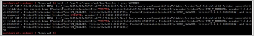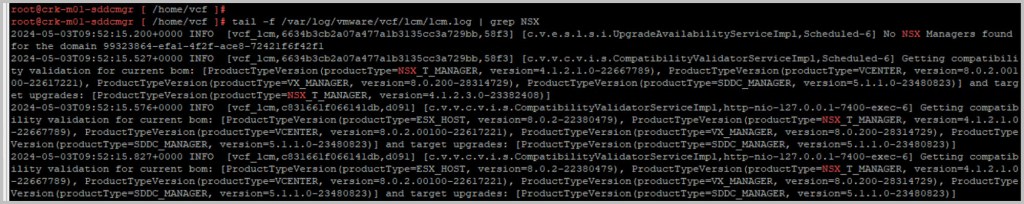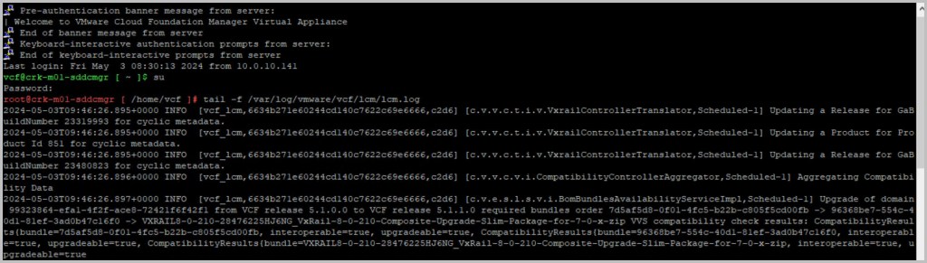 tail -f /var/log/vmware/vcf/lcm/lcm.log