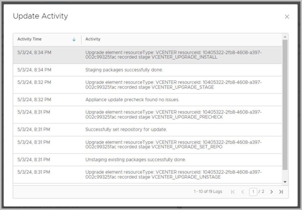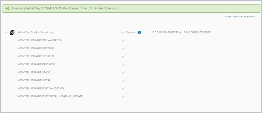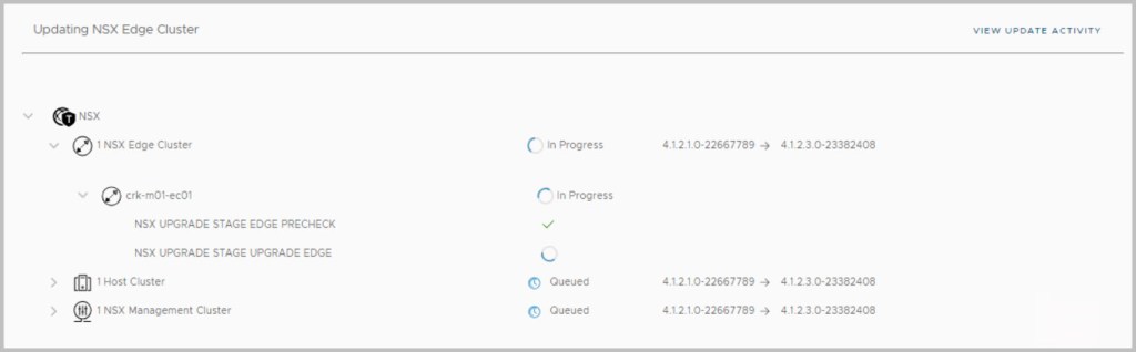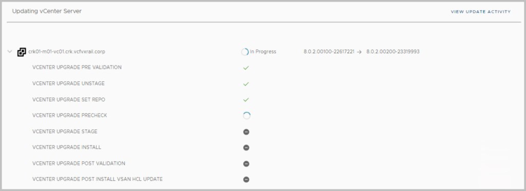 While proceeding with the updates, click on View update activity to monitor progress and track progress via the lcm log: