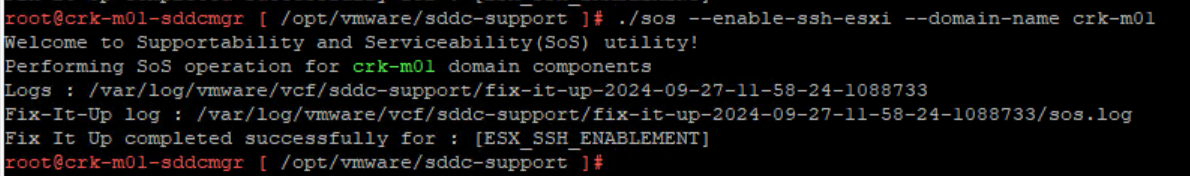 cd /opt/vmware/sddc-support ./sos --enable-ssh-esxi --domain-name ALL