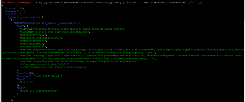 mcp_python /usr/lib/vmware-loudmouth/loudmouthc.py query | tail -n 1 | sed '/^Received: {/s/Received: //1' | jq