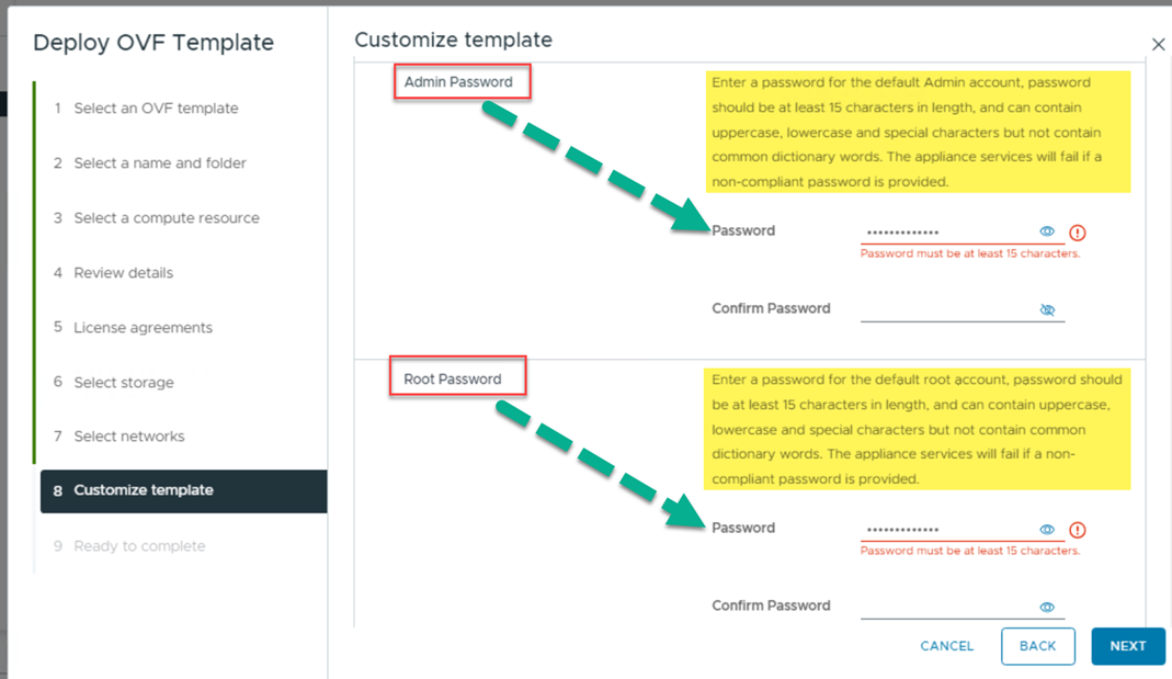 Deploying Cloud-builder OVF detailing new password complexity requirements for Admin/Root passwords:
