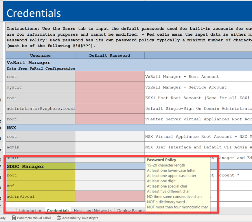 Credentials tab of the parameter sheet detailing new password complexity requirements for SDDC Manager: