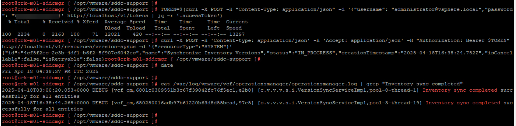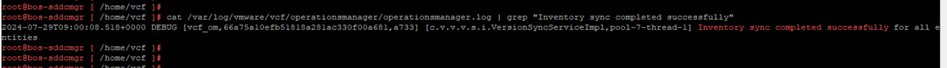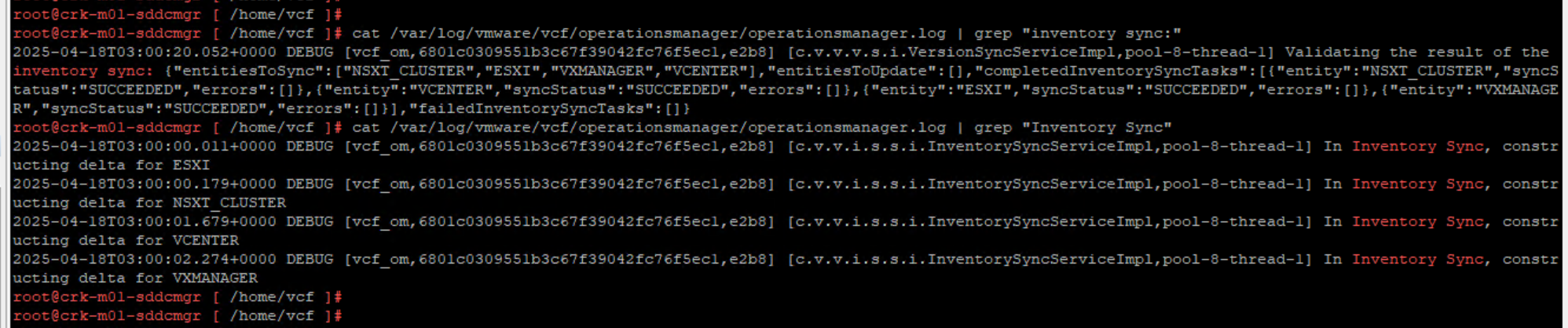 By default a scheduled daily cron job runs at 3:00 AM server time to sync the inventory versions of managed products on the SDDC Manager appliance. Auto-reconciliation is triggered immediately if any deviation is detected during the scheduled sync. This ensures that the versions recorded in the SDDC Manager inventory reflect the actual state of the deployed environment. You can monitor the status and logs of the inventory sync process in the following log file: