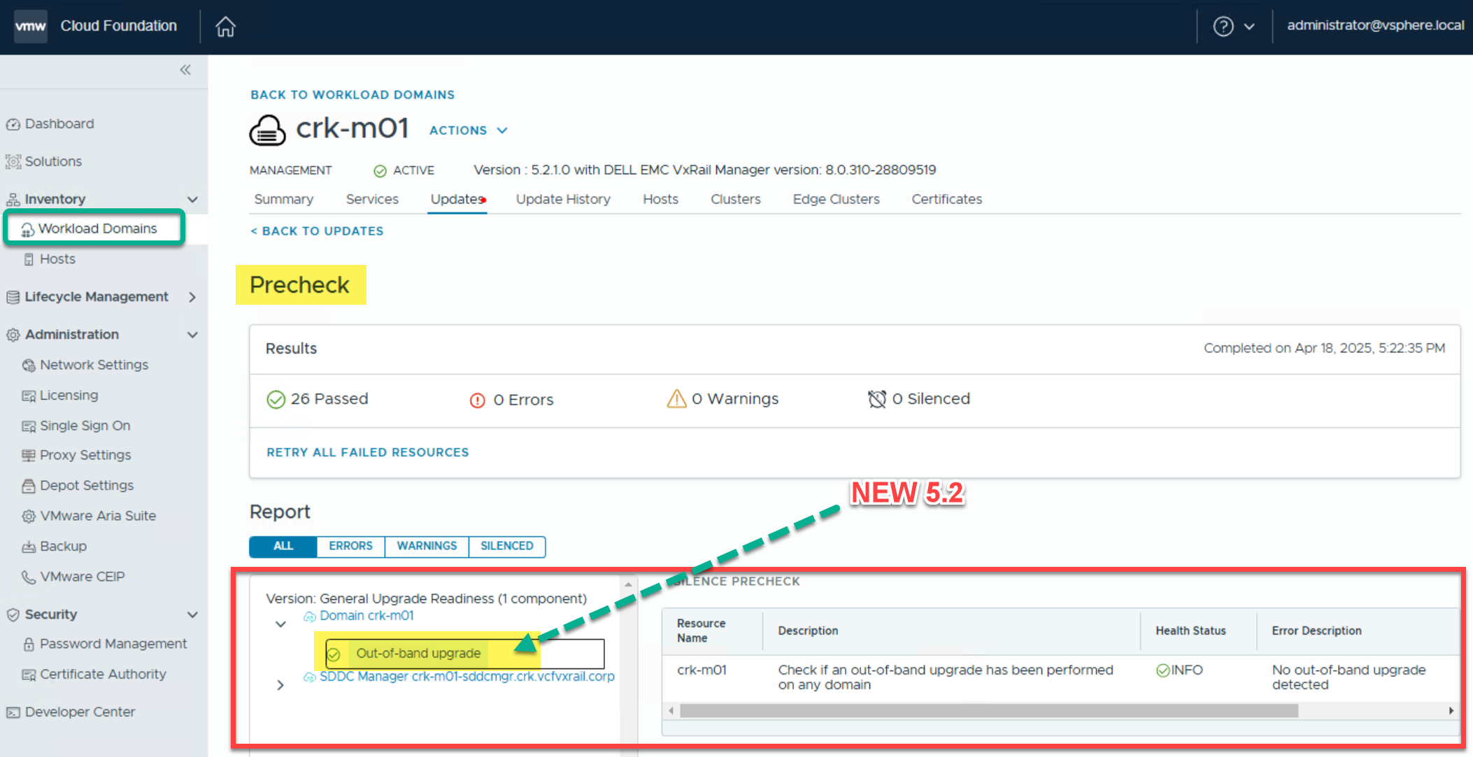 This enhancement provides automatic in-product recovery for environments that become out-of-sync due to out-of-band (OOB) patching, eliminating the need for manual inventory synchronization using ApTool. This enhancement ensures that product versions in the VCF inventory accurately reflect the actual deployed environment, improving lifecycle management. As part of the default automated daily 3:00 AM cron job or during on-demand prechecks, SDDC Manager now automatically detects and reconciles inventory mismatches, significantly reducing operational overhead and enhancing the overall upgrade and patching experience.
