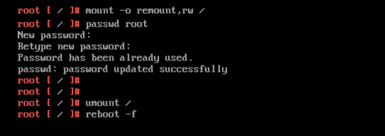 Run the command mount -o remount,rw / to remount the root filesystem with write permissions. If the root account is locked due to multiple failed login attempts, unlock it using /usr/sbin/faillock --user root --reset ( pam_tally2 is deprecated in Photon 4). Set a new root password by entering passwd and confirming it twice. Once done, unmount the filesystem using umount / , and then reboot the appliance with reboot -f.