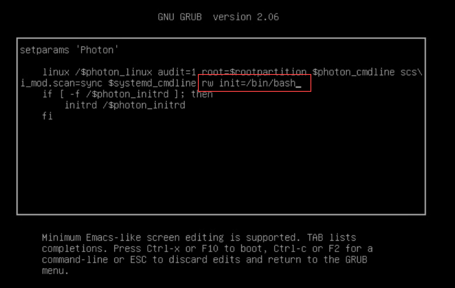 Find the line starting with “linux” and append: rw init=/bin/bash.