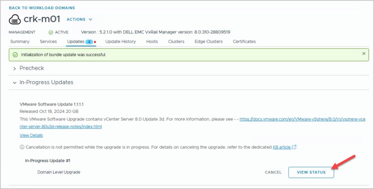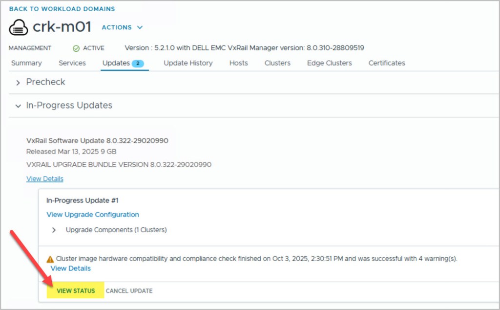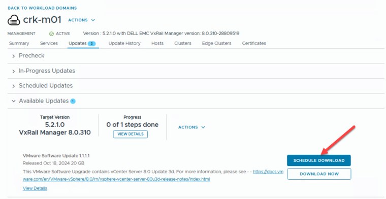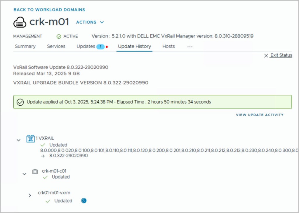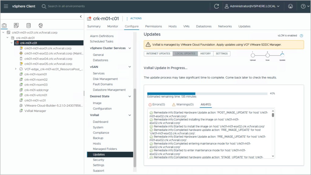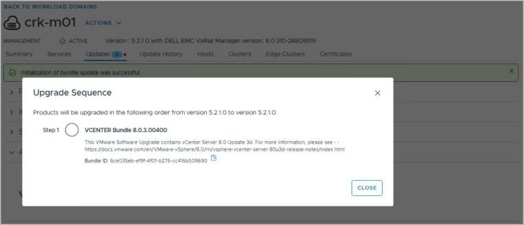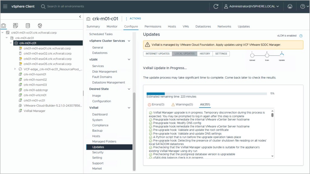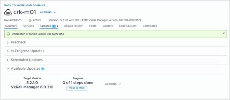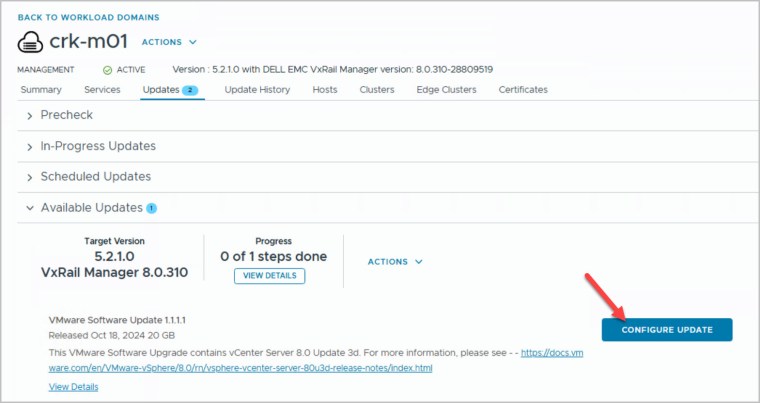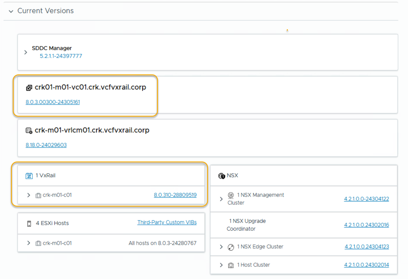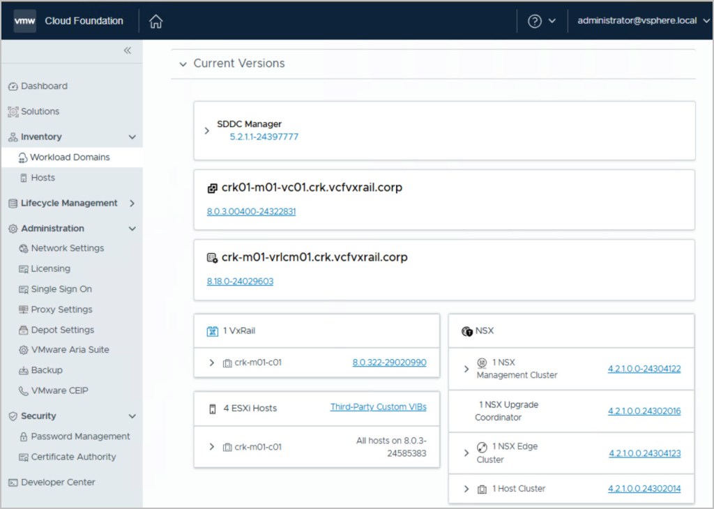 In this example, the environment is currently running VMware Cloud Foundation (VCF) 5.2.1.1 with VxRail version 8.0.310.