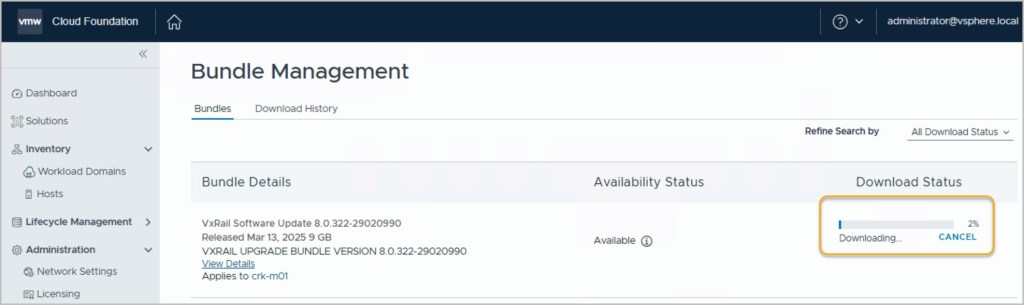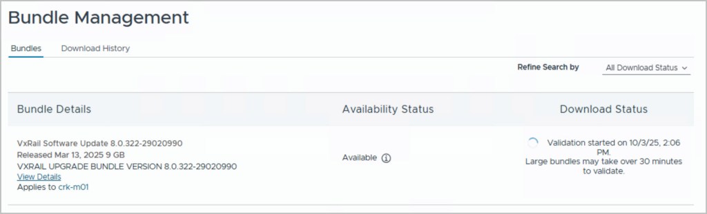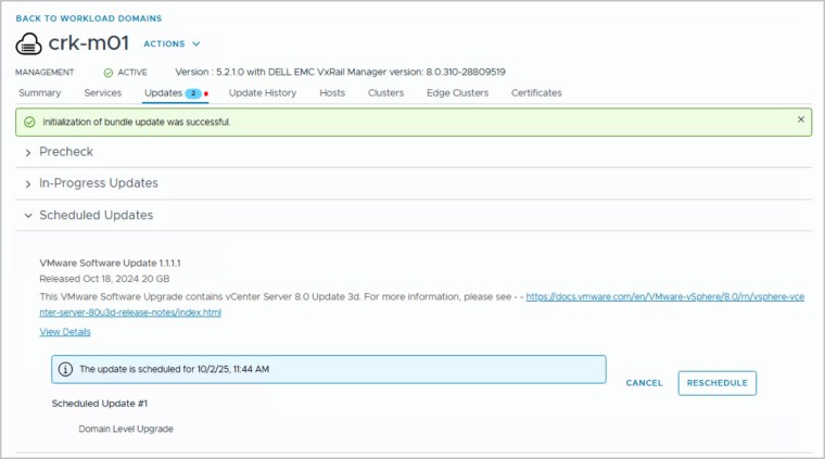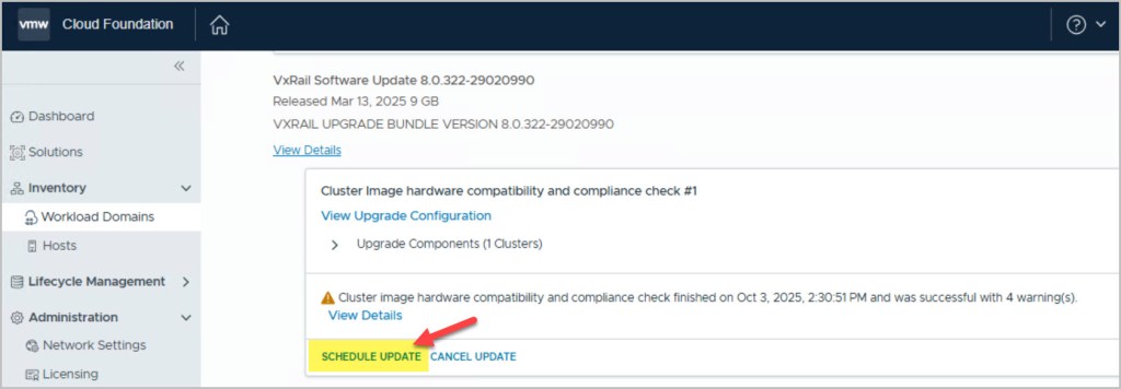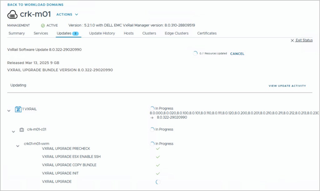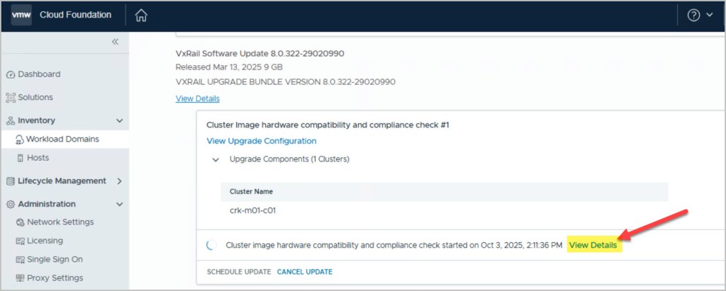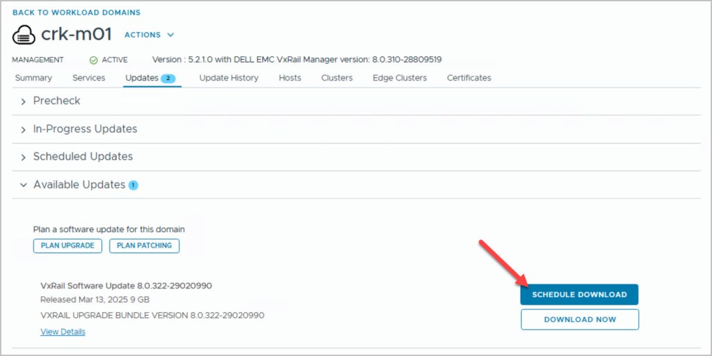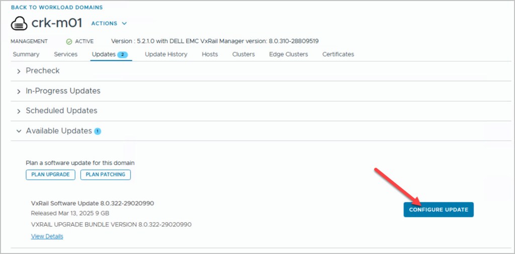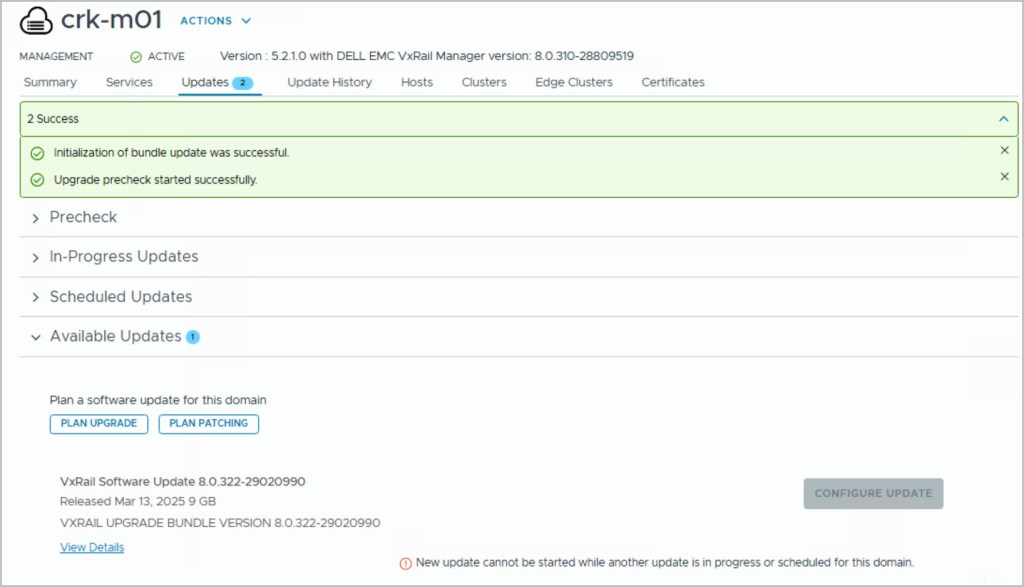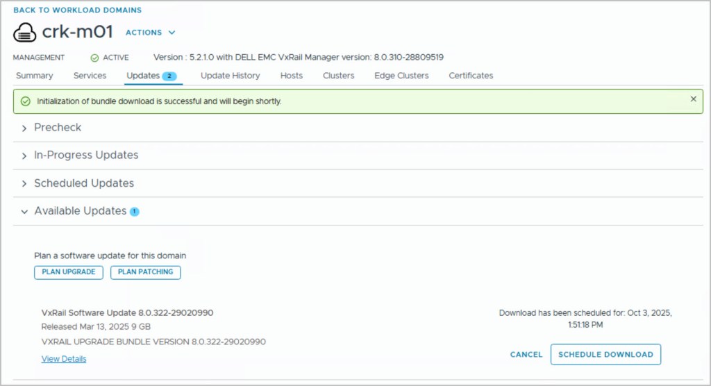Next, we move on to the VxRail upgrade using the Flexible BOM (FlexBom) capability. With vCenter Server already upgraded to 8.0 Update 3d, we can now safely proceed with updating VxRail to version 8.0.322, which includes ESXi 8.0 Update 3d. This targeted upgrade approach allows us to patch VxRail independently, without requiring a full VCF stack upgrade. The following screenshots walk through the FlexBom patching process as executed from SDDC Manager, showing how the VxRail upgrade is staged, validated, and applied in alignment with the asynchronous patching framework supported in VCF 5.2.1.1.