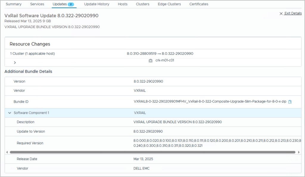 I’ll demonstrate how to use FlexBom patching to upgrade the VxRail code level to version 8.0.322. This VxRail release includes ESXi 8.0 Update 3d. As part of the upgrade process, it’s critical to follow the correct sequence: vCenter Server must first be upgraded to VMware vCenter Server 8.0 Update 3d before applying the VxRail update. This ensures proper compatibility and alignment with the underlying ESXi version included in the VxRail bundle.