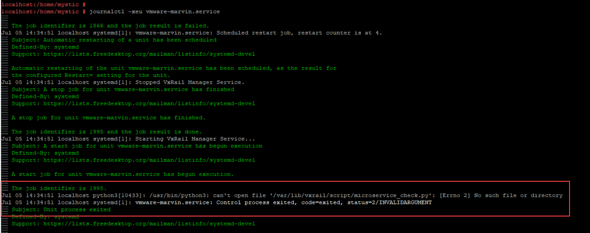 journalctl -xeu vmware-marvin.service