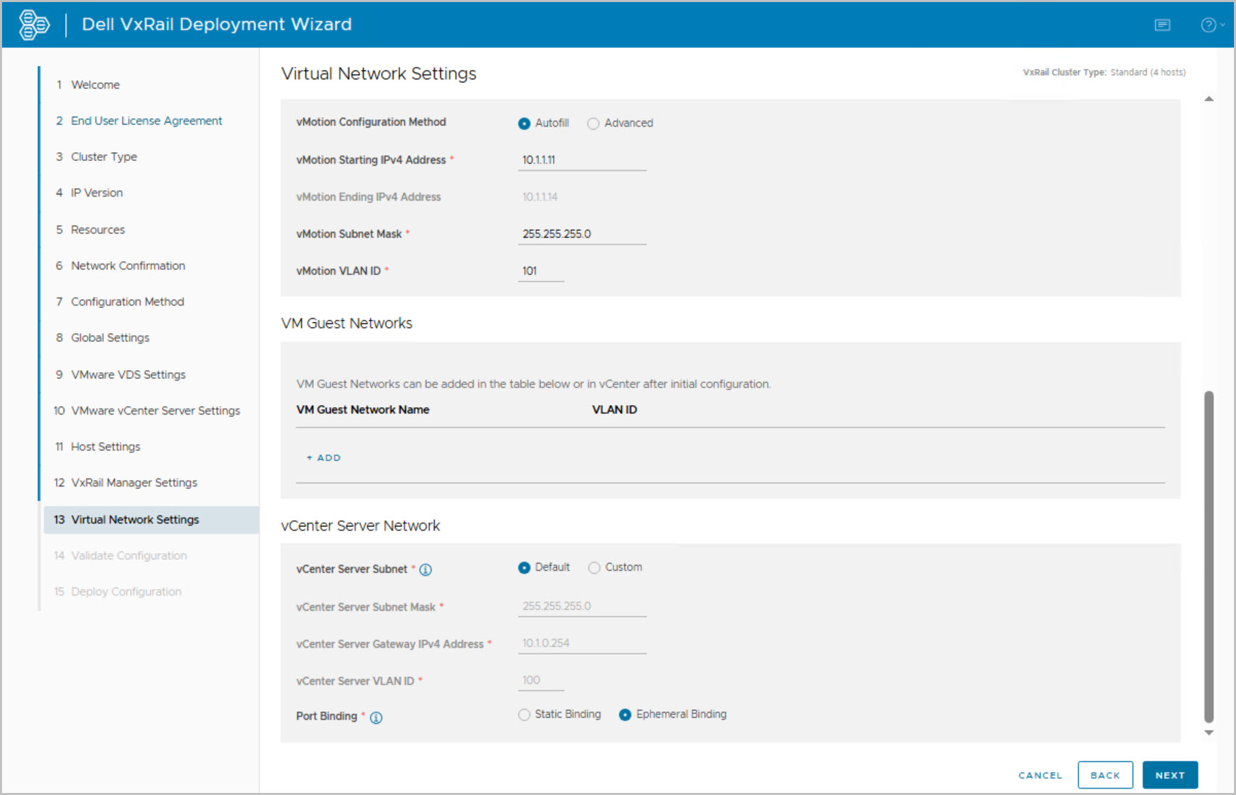 The VxRail deployment process for the Management Cluster closely resembles the standard VxRail setup, where an embedded vCenter is initially deployed. Previously, externalizing the vCenter required manual intervention through the VxRail Manager plugin in the vCenter HTML client. However, this step is now fully automated as part of the Cloud Builder bring-up process. Additionally, changing the Management port group to an Ephemeral port type after the VxRail deployment is no longer necessary. This configuration can now be selected during the VxRail deployment itself, as demonstrated in the following walkthrough. Furthermore, the SSH service on each ESXi host is disabled by default as part of the deployment process.