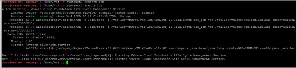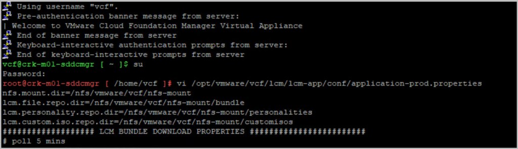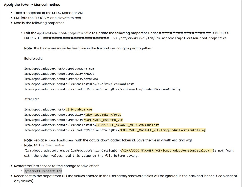 The following screenshots also highlight steps from the Broadcom token implementation process. In this example, the token is applied directly to the SDDC Manager using the manual method outlined in Broadcom KB389871. Prior to making any changes, a snapshot of the SDDC Manager VM is taken to provide a safe rollback point. The SDDC Manager is then accessed via SSH, privileges are elevated to the root user, and the LCM depot configuration is updated by modifying the application-prod.properties file located at /opt/vmware/vcf/lcm/lcm-app/conf/.