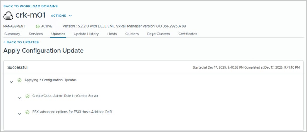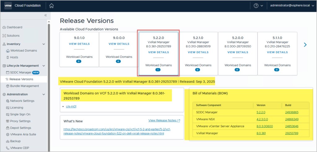 Versions used in this example are VCF 5.2.2 On VxRail 8.0.361. Release Information:
