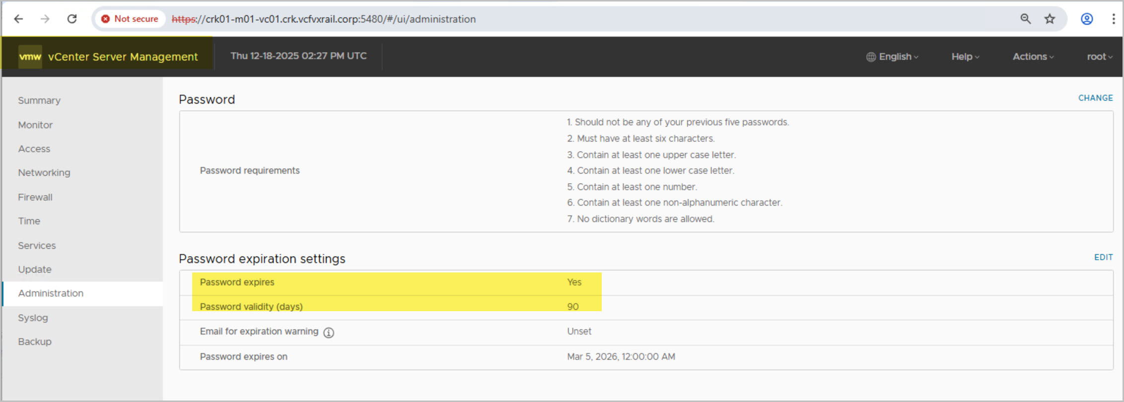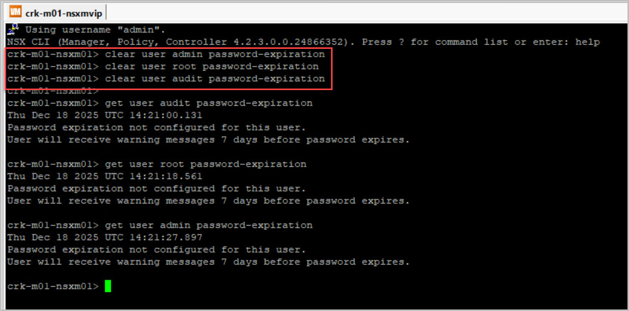 If you wish to disable password expiration for NSX Manager and vCenter accounts, follow these steps: