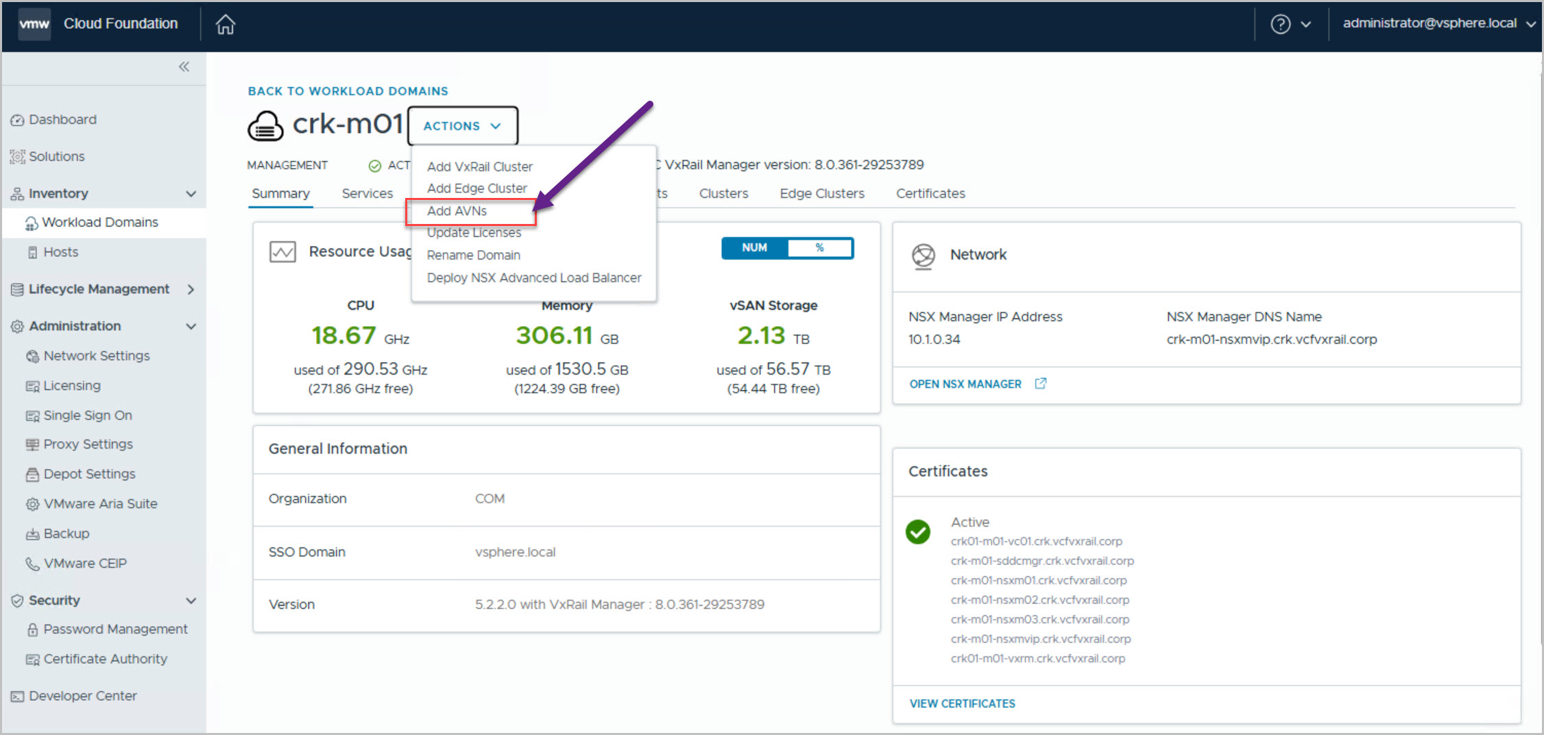 Go to SDDC Manager UI Select Inventory > Workload Domains. Click on the name of the Management domain Select Actions > Add AVNs: