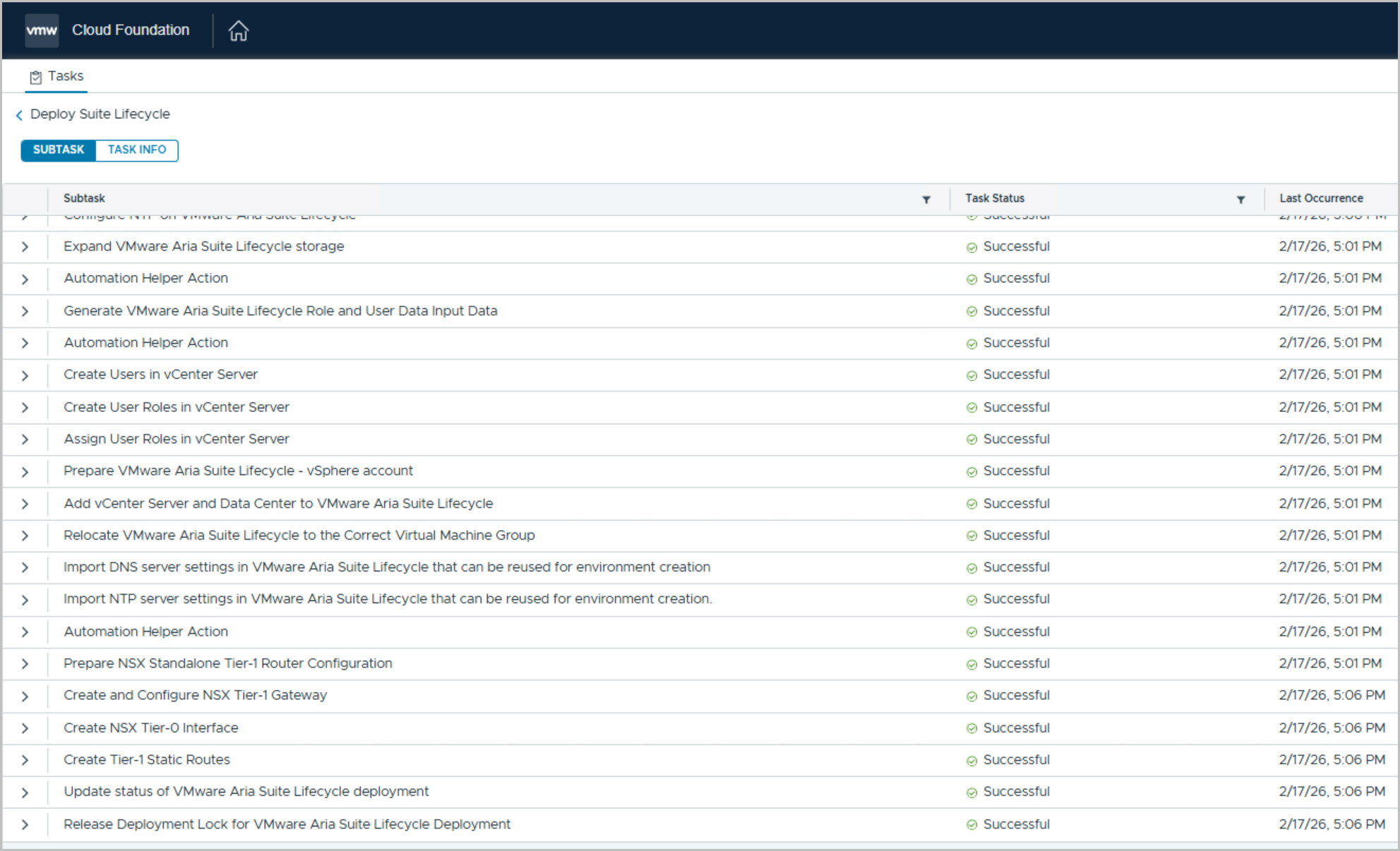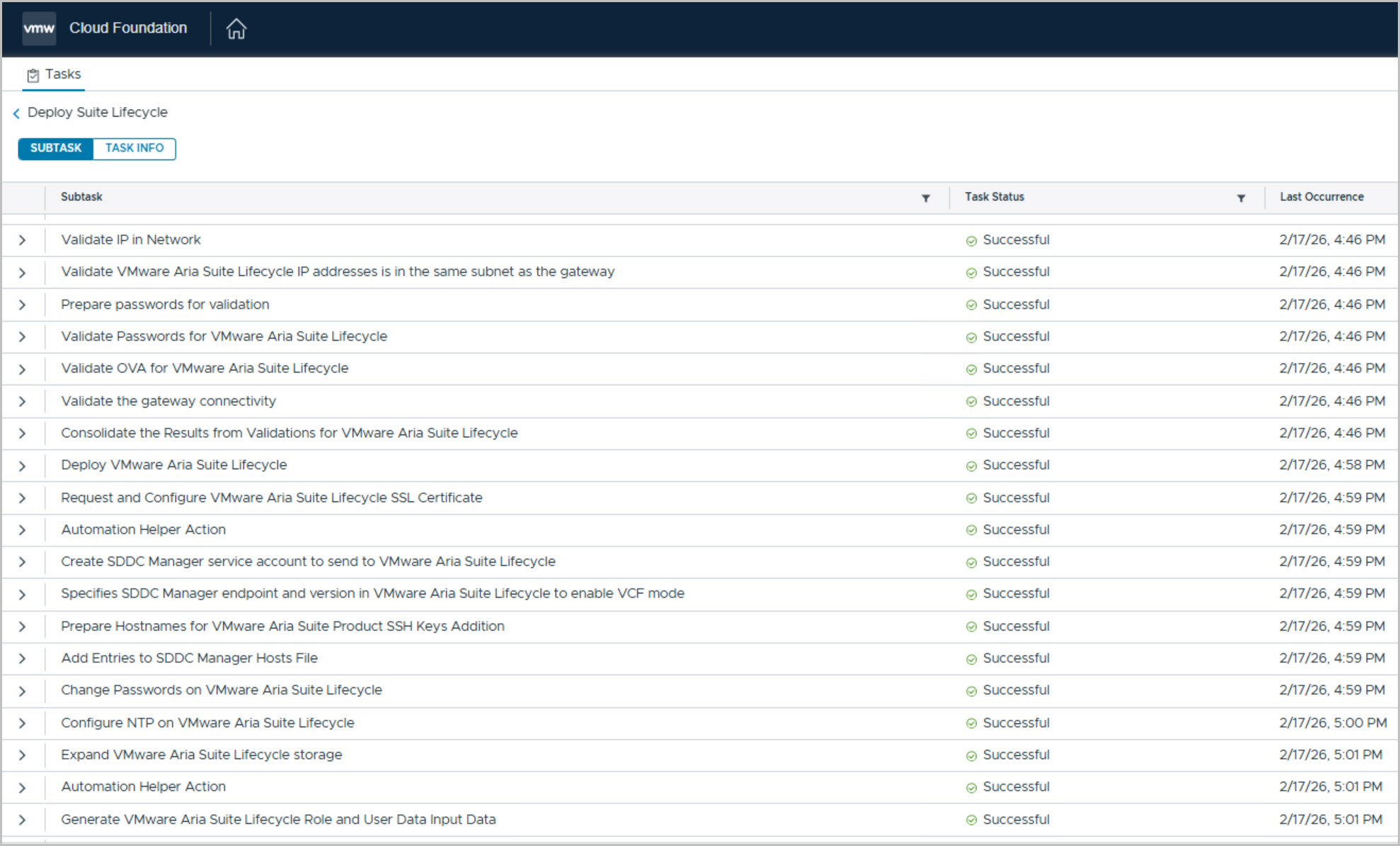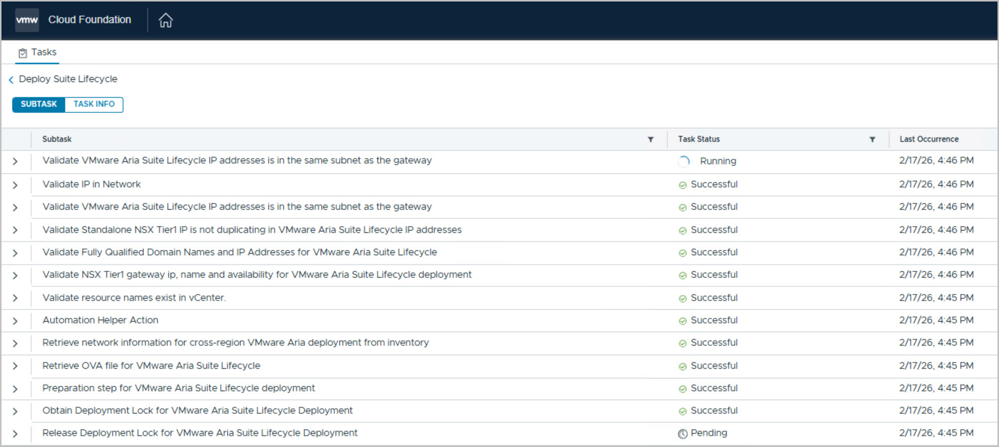 Deployment in progress. Click on task and open the deploy Aria Suite Lifecycle task to track progress of the installation. Details of tasks performed during the Aria Suite Lifecycle deployment:
