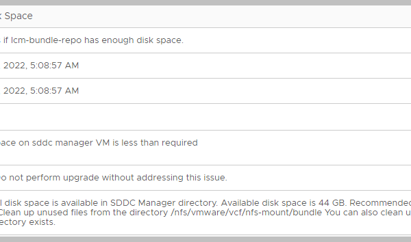 Over time there may be a build-up of downloaded bundles which can consume a lot of space on the SDDC Manager bundle repo. In this case during an upgrade Pre-Check […]